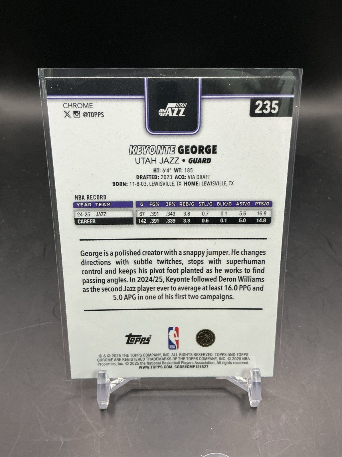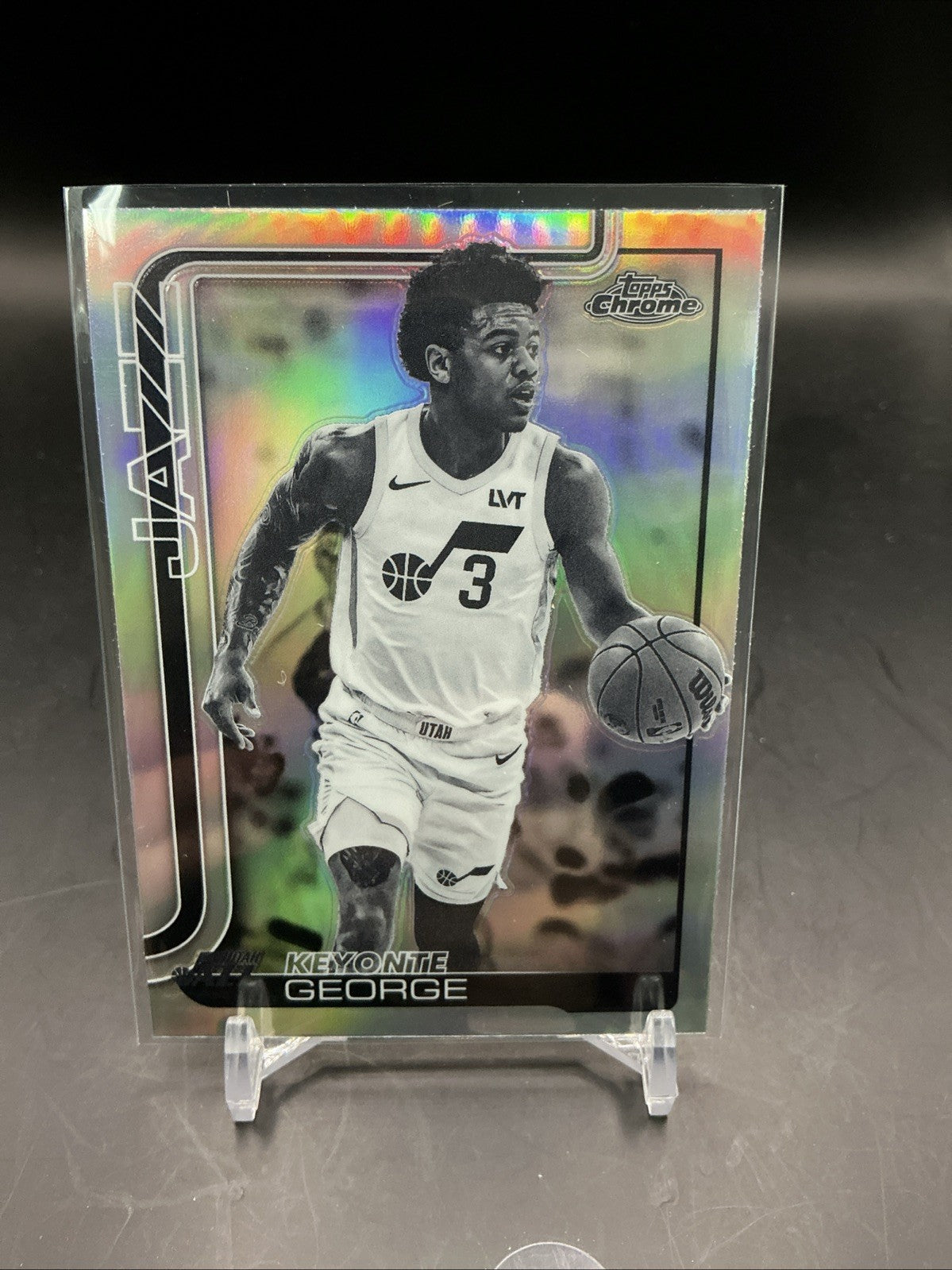 The product is a rare Keyonte George negative refractor trading card from the 2025 Topps Chrome Basketball set. This card features a short print design and is part of the Chrome parallel variety. Manufactured by Topps, it is a sought-after collectible for basketball fans and card collectors. The card showcases Keyonte George in his Utah Jazz uniform, making it a valuable addition to any NBA trading card collection.
