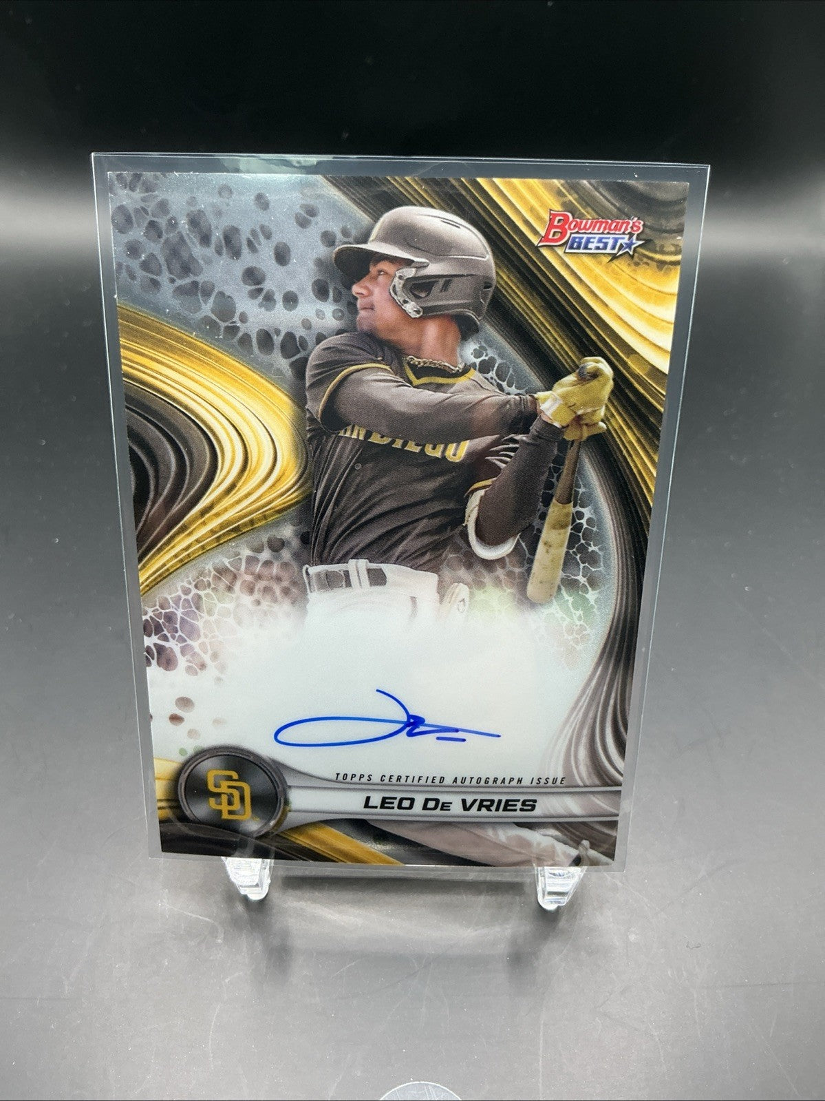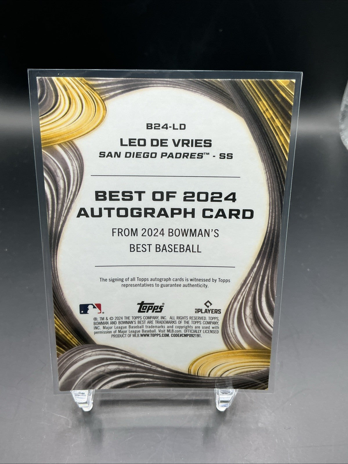 The product is a 2024 Bowman's Best trading card featuring an autograph of baseball player Leo De Vries from the San Diego Padres. This card is part of the Best of 2024 Autographs insert set by Topps, known for its hard-signed autographs. As a rookie card with the card number B24-LD, this collectible item is a valuable addition for fans and collectors of Major League Baseball trading cards.