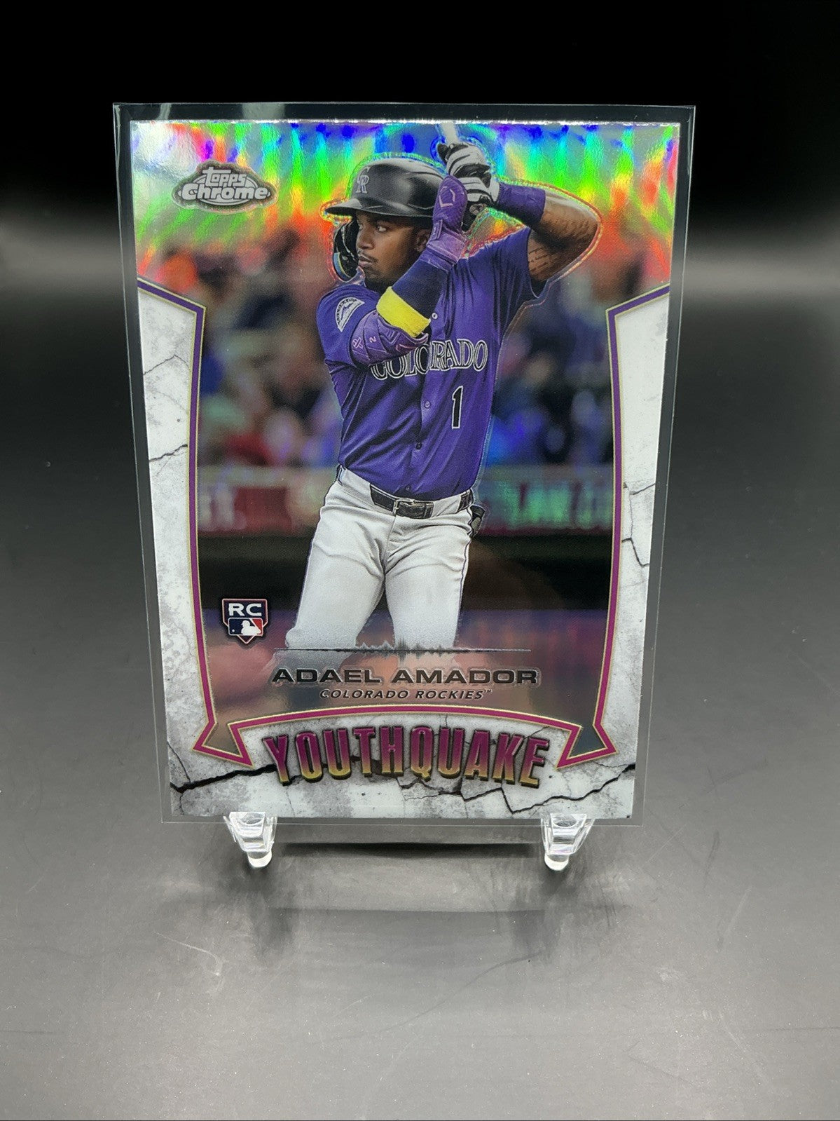 The product is a 2025 Topps Chrome Adael Amador Youthquake Rookie Card for the Colorado Rockies (#YQ-11). This sports trading card features the MLB player Adael Amador in his rookie season, manufactured by Topps in 2025. The card is part of the Topps Chrome set and is a chrome parallel variety, making it a desirable collectible item for baseball fans and trading card enthusiasts alike.