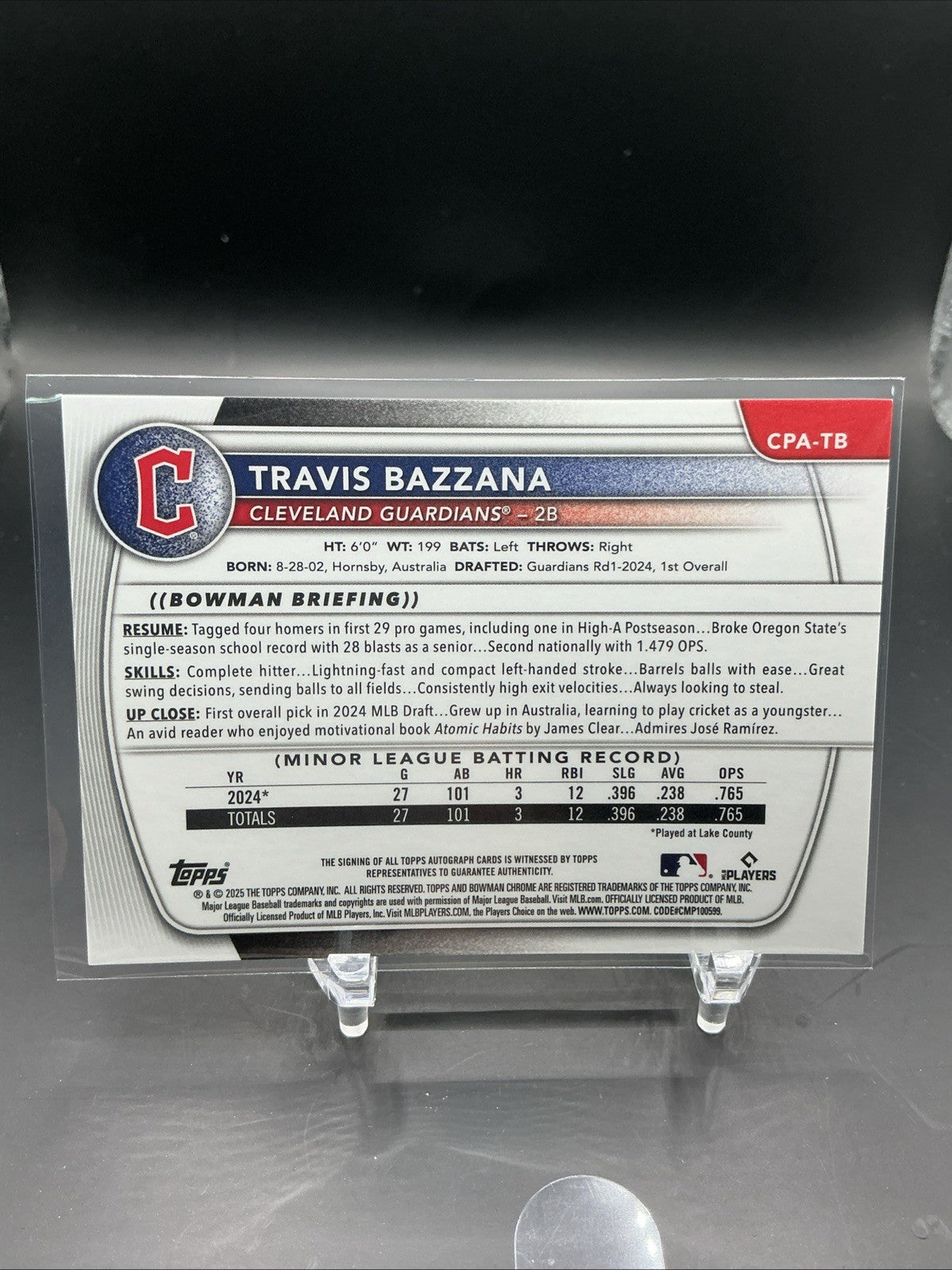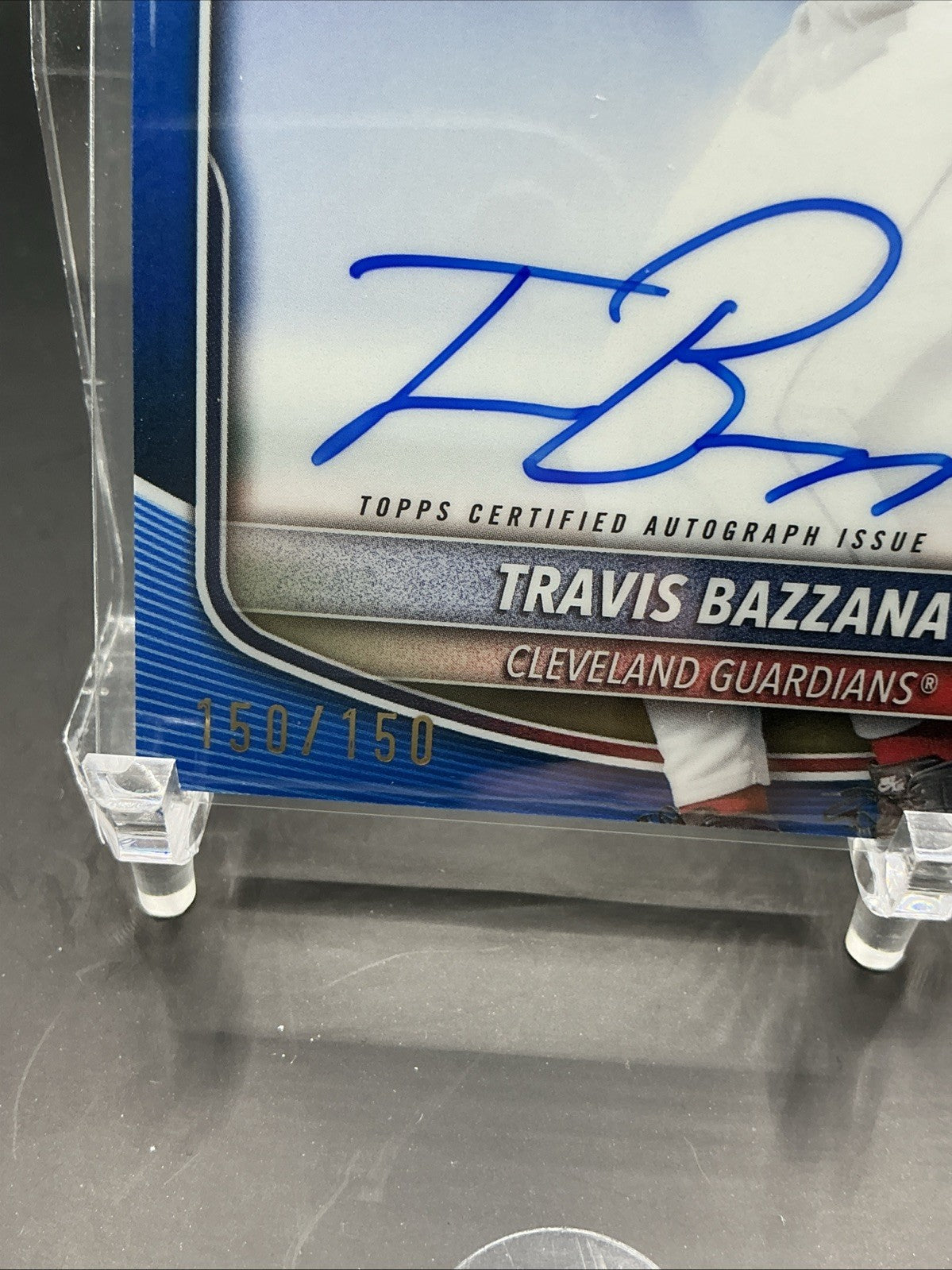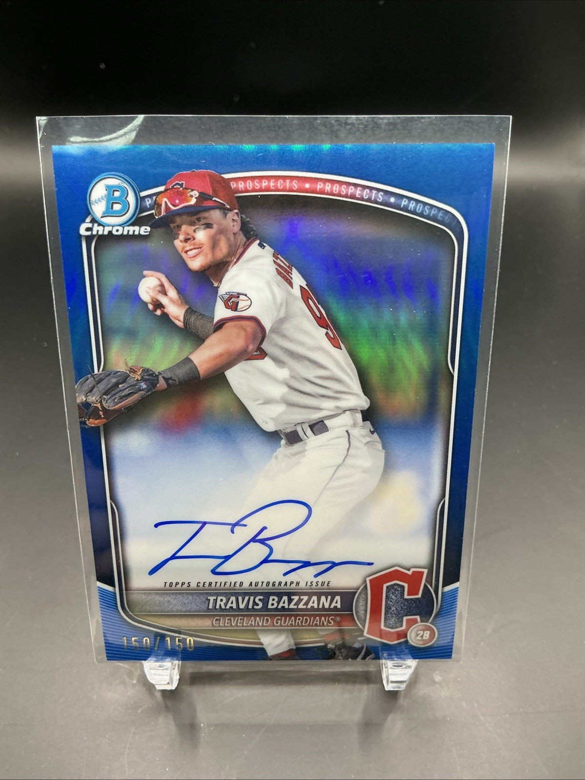 The product is a rare and highly sought-after Travis Bazzana 2025 Bowman Chrome Prospect True Blue Auto trading card. This limited edition card is numbered 150/150 SSP, making it a true rare find for baseball card collectors. Manufactured by Bowman, known for producing high-quality sports trading cards, this card features a unique True Blue parallel variety, adding to its exclusivity. Perfect for fans of baseball and trading card enthusiasts, this card is a standout addition to any collection, showcasing a promising prospect for the 2025 season.