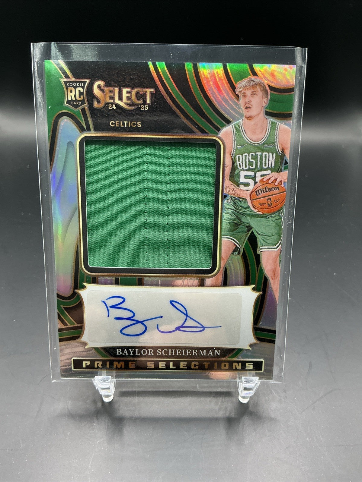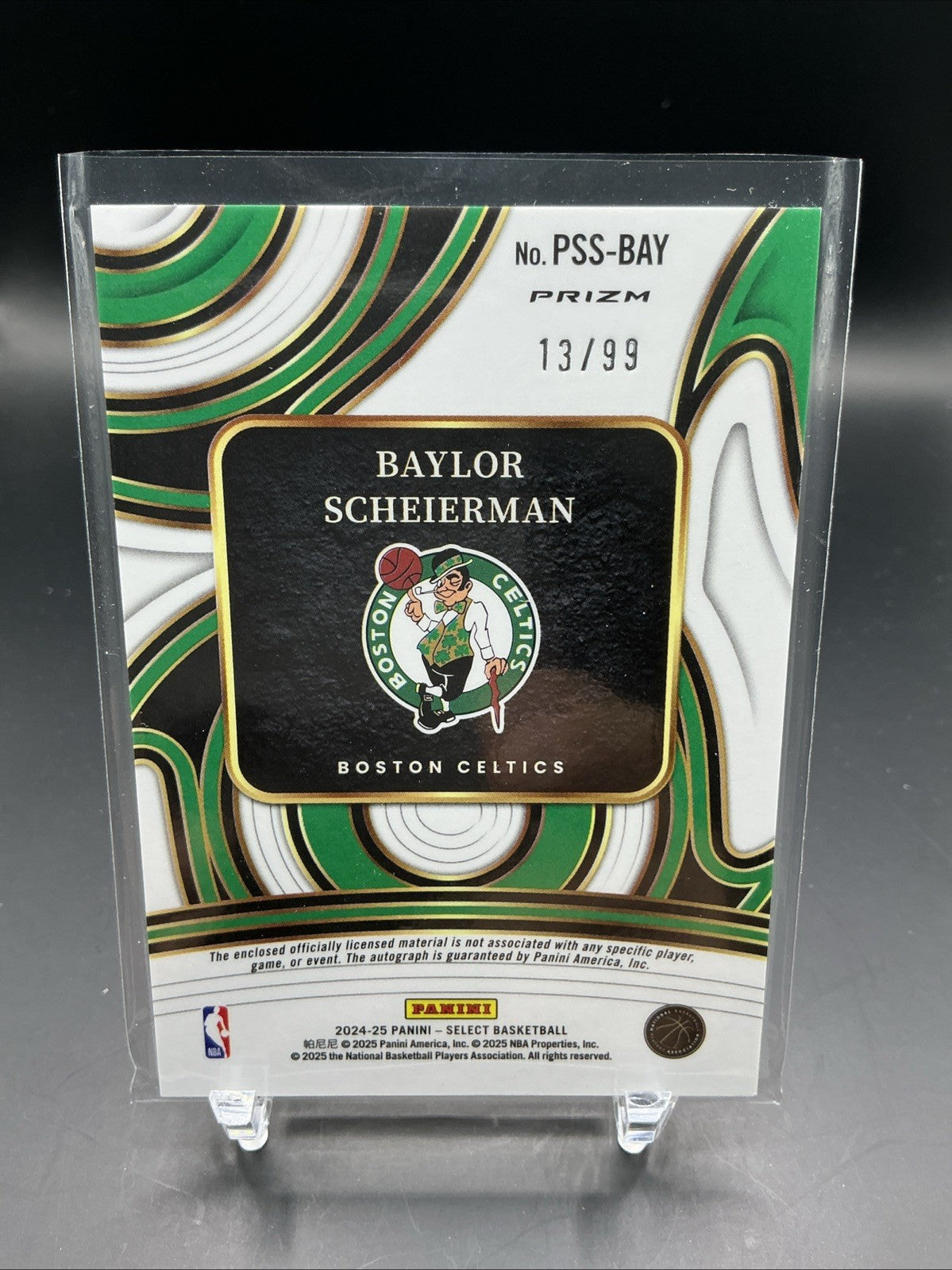 The 2024-25 Panini Select Baylor Scheierman Prime Selections Auto /99 is a highly coveted basketball trading card featuring an autograph from the rookie player Baylor Scheierman. Manufactured by Panini, this limited edition card is part of the Signatures parallel/variety set and is numbered 120-17 in the Panini Select series. With only 99 copies produced, this collectible item is a must-have for fans of the Boston Celtics and basketball trading card enthusiasts alike.