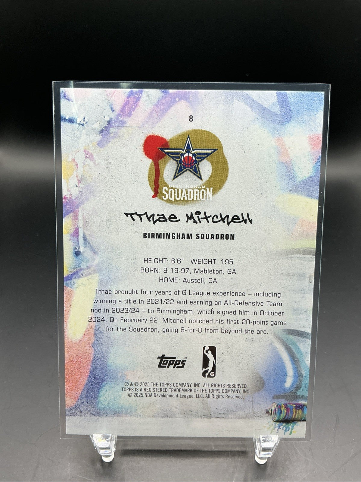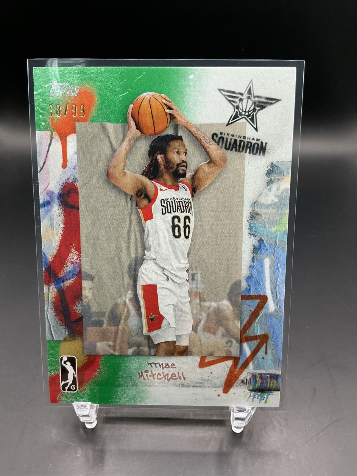The product is a 2024-25 Topps G-League trading card featuring Trhae Mitchell of the Birmingham Squadron. This card is a Green parallel with a limited edition of only 99 copies. It is a non-autographed rookie card from the Topps manufacturer, making it a valuable addition for basketball card collectors. The card captures a key moment in the 2024-25 season and is sure to be a sought-after item for fans of the NBA and basketball trading cards.