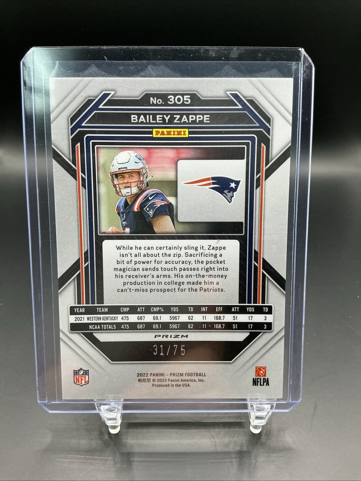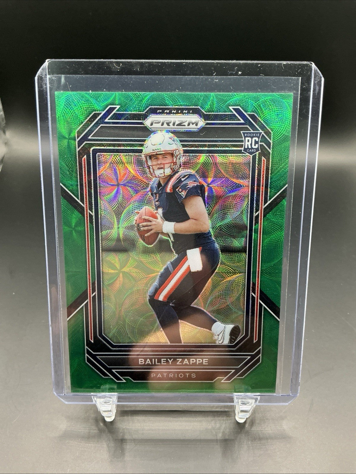 The product is a 2022 Panini Prizm Rookies Green Scope trading card featuring Bailey Zappe, a rookie player from the New England Patriots. This single-parallel card is an original release by Panini America, Inc. and is limited to only 75 copies. It is part of the Green Scope Prizm set for the 2022 football season, making it a highly sought-after collectible for fans and collectors of sports trading cards.