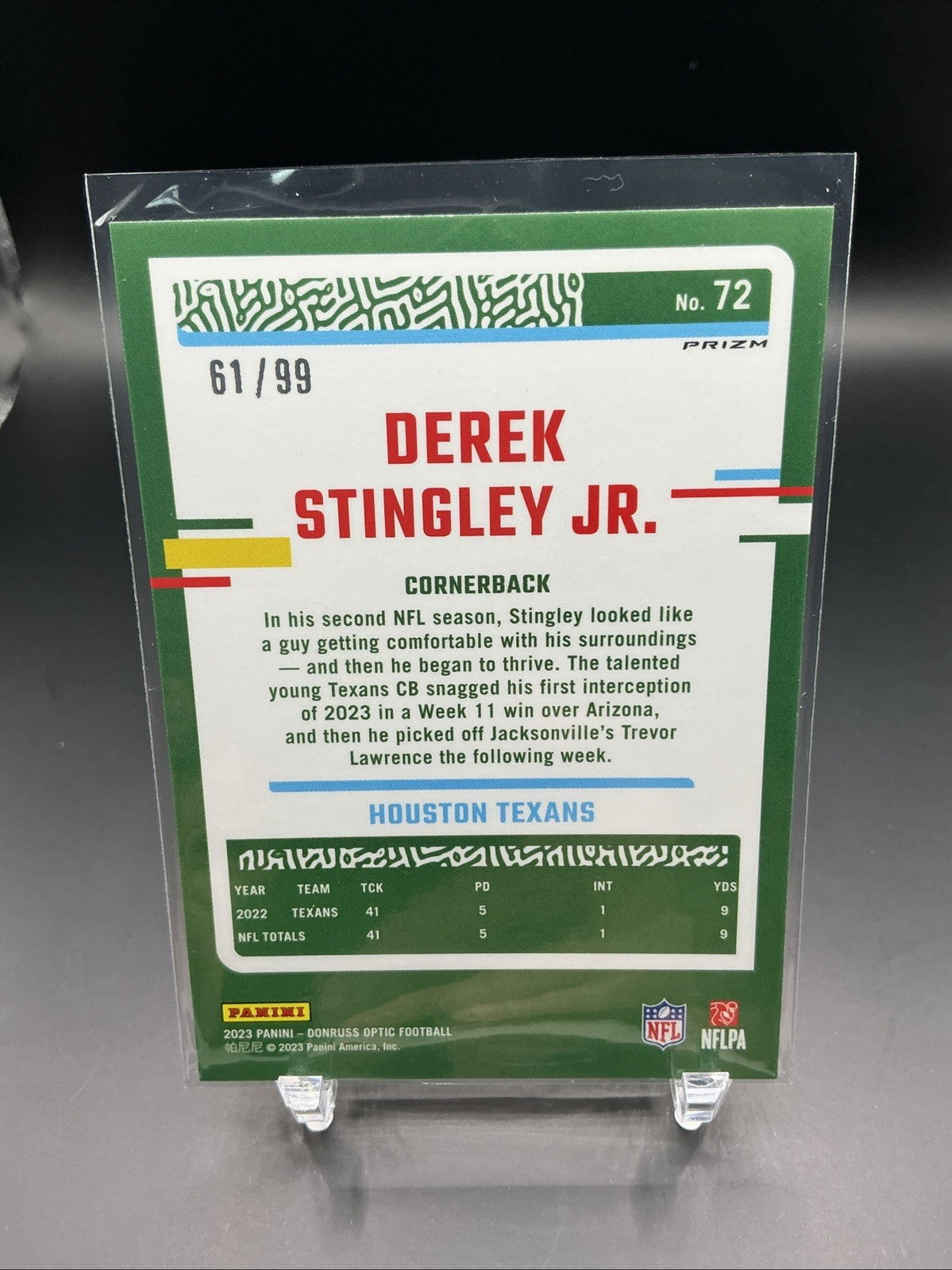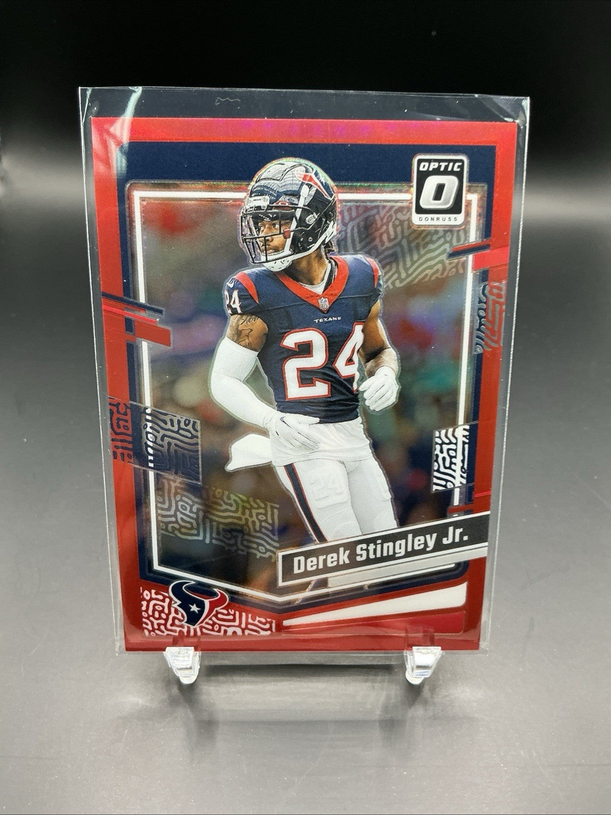 The 2023 Donruss Optic Red #72 Derek Stingley Jr. football card is a limited edition trading card featuring the Houston Texans player. With a print run of only 99, this original card from Donruss is part of the Optic parallel variety, making it a highly sought-after collectible for fans and collectors alike. It is a valuable addition to any sports trading card collection, especially for those who are fans of the Houston Texans and football enthusiasts.