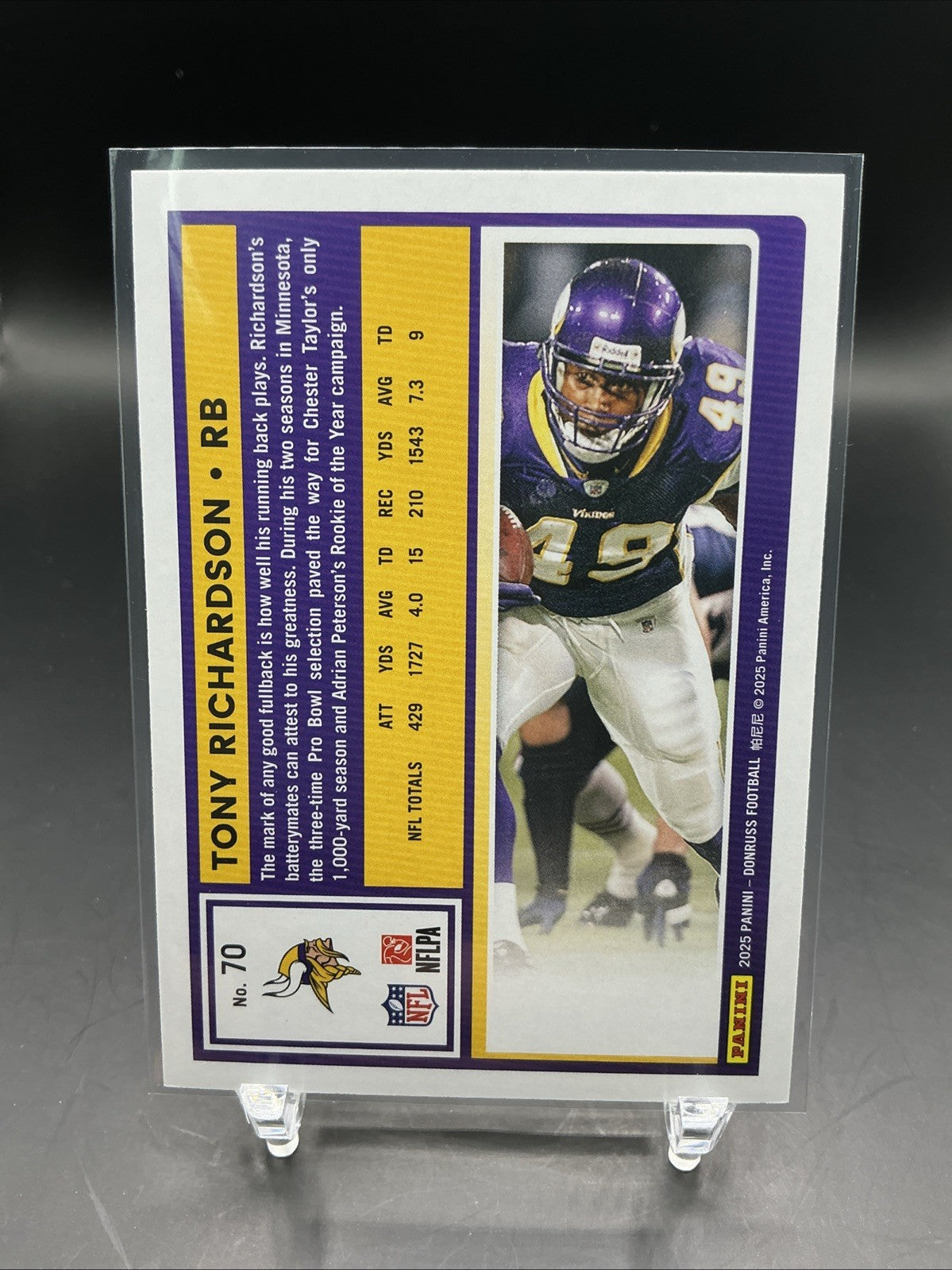 The 2025 Panini Donruss Tony Richardson #70 Press Proof Gold trading card is a highly collectible football card featuring the player Tony Richardson from the National Football League. This limited edition card is part of the 2025 Panini Donruss set and is made of 20 Pt. card stock. With only 49 copies in existence, this original card is a rare find for fans and collectors alike. The card showcases a Press Proof Purple parallel design and is authenticated by Donruss, adding to its value and appeal to enthusiasts of football trading cards.