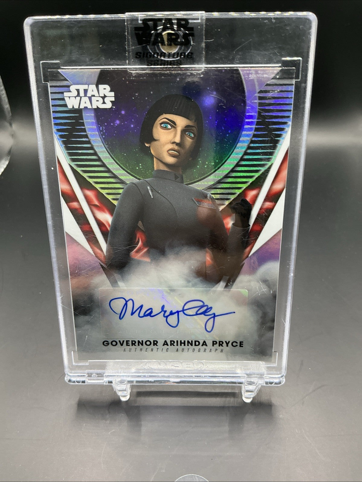 The 2023 Topps Star Wars Signature Series #A-MMC Mary Elizabeth McGlynn Governor trading card is an authentic autographed collectible featuring the character Mary Elizabeth McGlynn Governor Arihnda Pryce from the Star Wars franchise. This original card, measuring 4¼" x 2¾", is a must-have for fans of the Movies-TV series, making it a valuable addition to any collection. Signed by the actress herself, this unique item is a rare find for collectors looking to own a piece of Star Wars history.