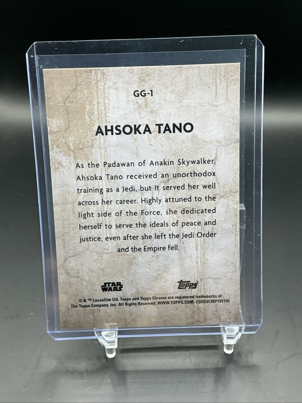 The 2025 Star Wars Topps Chrome Ahsoka Tano Galactic Graffiti SSP Case Hit GG-1 trading card is a highly sought-after collectible featuring the beloved character Ahsoka Tano from the Star Wars franchise. Manufactured by Topps for Star Wars Celebration, this non-sport trading card is made of card stock and comes in a standard size. It is an original print in English language with features like inserts and a parallel/variety status as a Case Hit. This card is a must-have for fans of Ahsoka Tano and the Star Wars universe, especially for collectors looking for unique and rare cards like this Galactic Graffiti SSP.