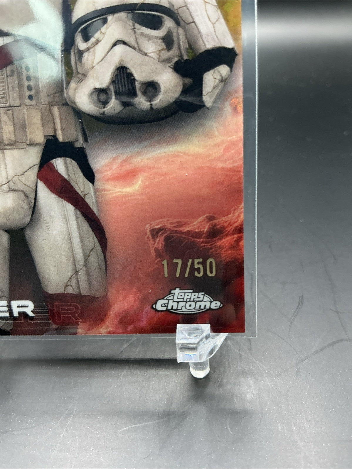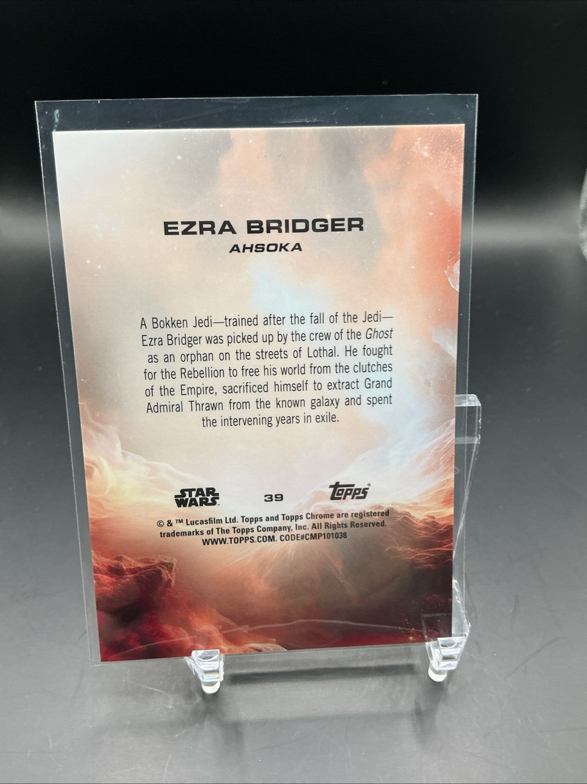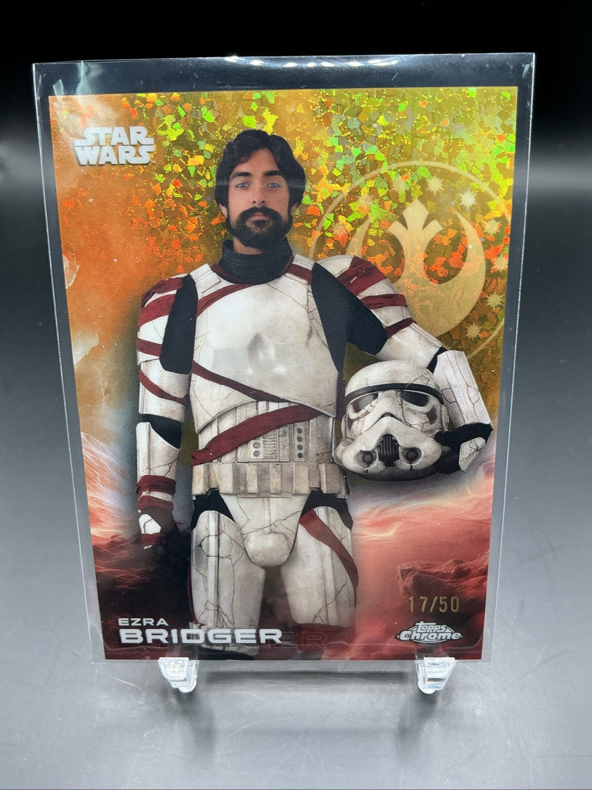The 2025 Topps Star Wars Chrome Erza Bridger Gold Speckle trading card is a highly collectible item limited to only 50 copies. Released as part of the Star Wars franchise, this original card manufactured by Topps is made of high-quality card stock and features a standard size. The card is autographed by Erza Bridger and comes with authentication from Topps, making it a sought-after piece for fans of the Star Wars series. This exclusive card is a must-have for any collector looking to add a rare and valuable piece to their collection.