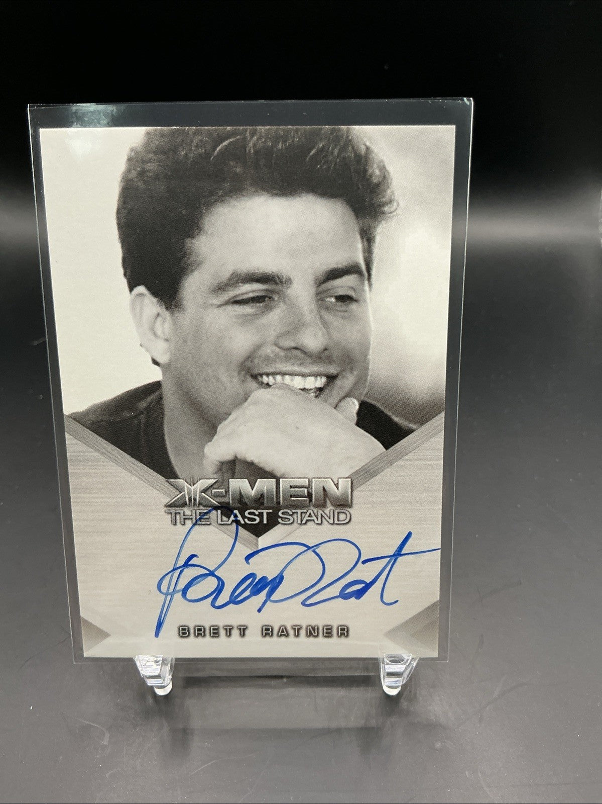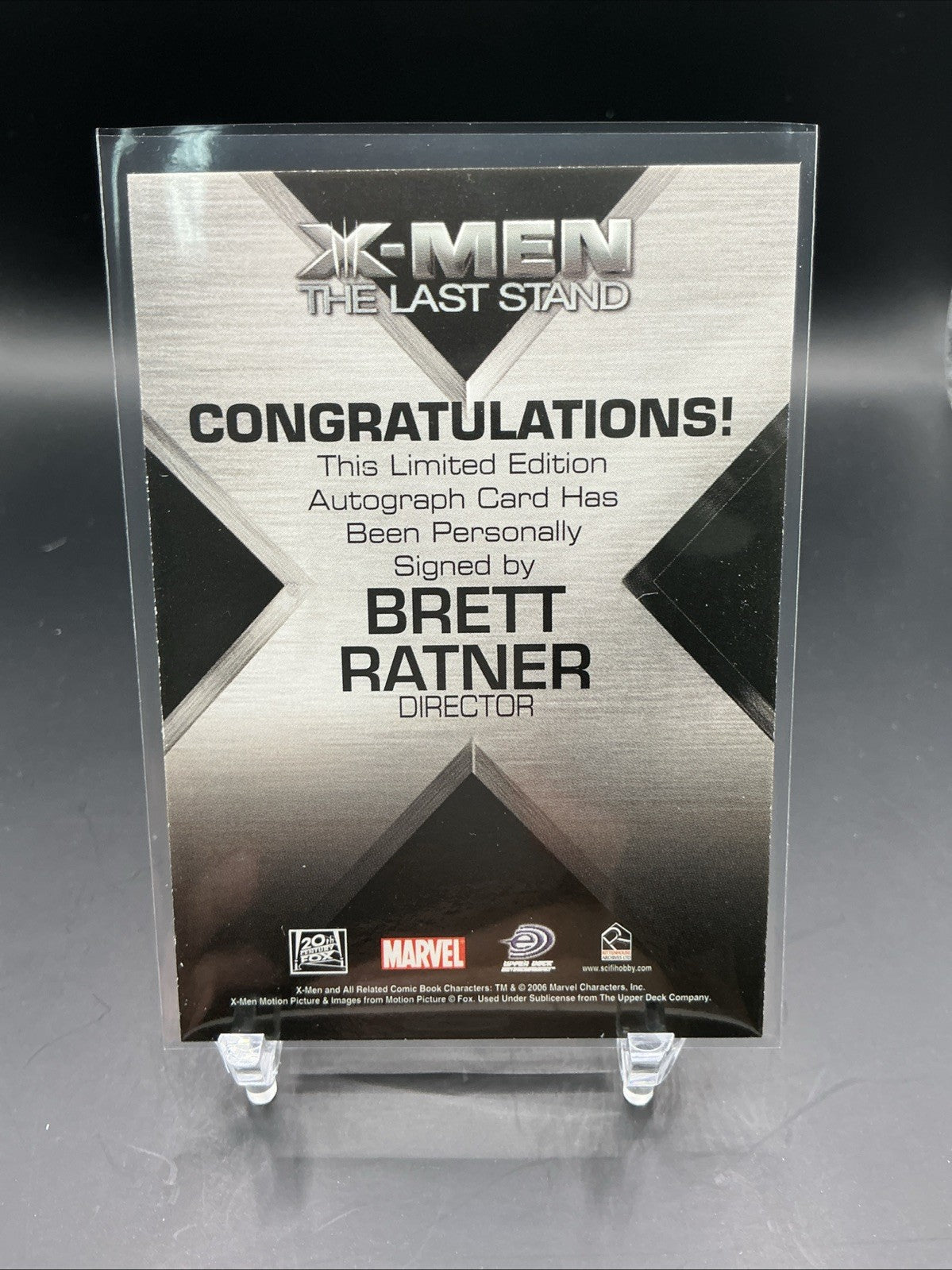 The product is a 2006 X-Men: The Last Stand autographed trading card featuring director Brett Ratner. This card is a case topper autograph, signed in hard format on standard card stock. It is part of the X-Men franchise and Marvel (MCU), making it a valuable collectible for fans of superhero, action, adventure, and TV & movies genres. The card is manufactured by Marvel and language is English, adding to its appeal for collectors and enthusiasts of non-sport trading cards.