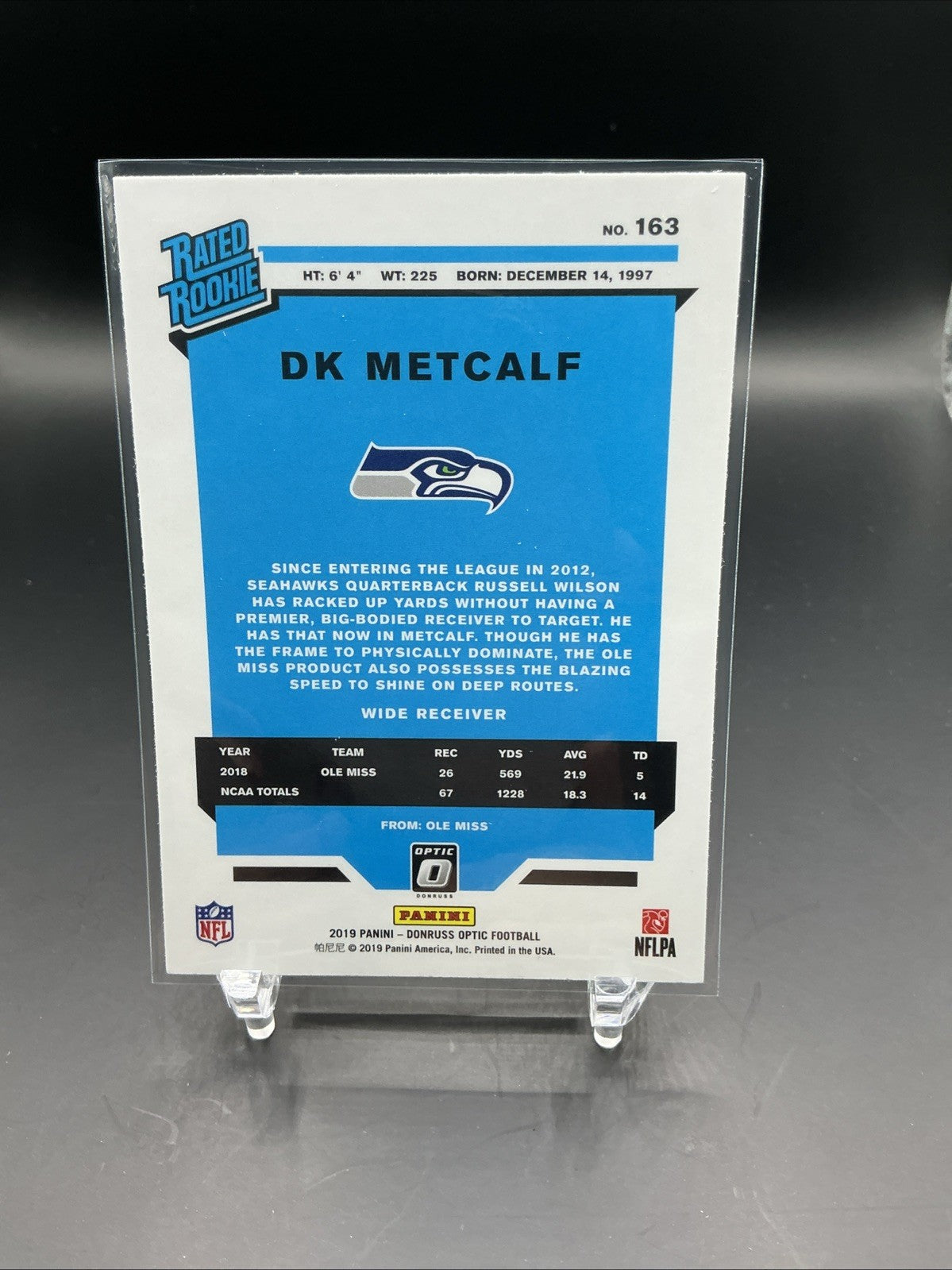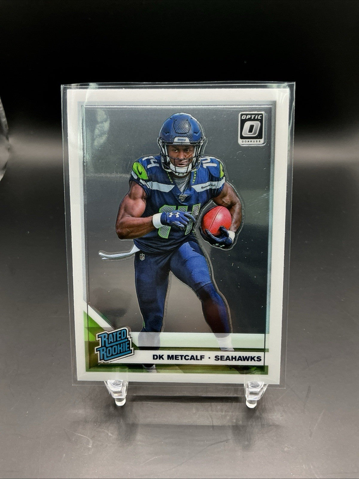 The #163 2019 Panini Donruss Optic Rated Rookie DK Metcalf trading card is a highly sought-after collectible for football fans and trading card enthusiasts. This card features the talented rookie from the Seattle Seahawks in the National Football League, making it a valuable addition to any sports memorabilia collection. With its base set design and clear image of DK Metcalf, this card captures the excitement of the 2019 season and is a must-have for fans of the sport.