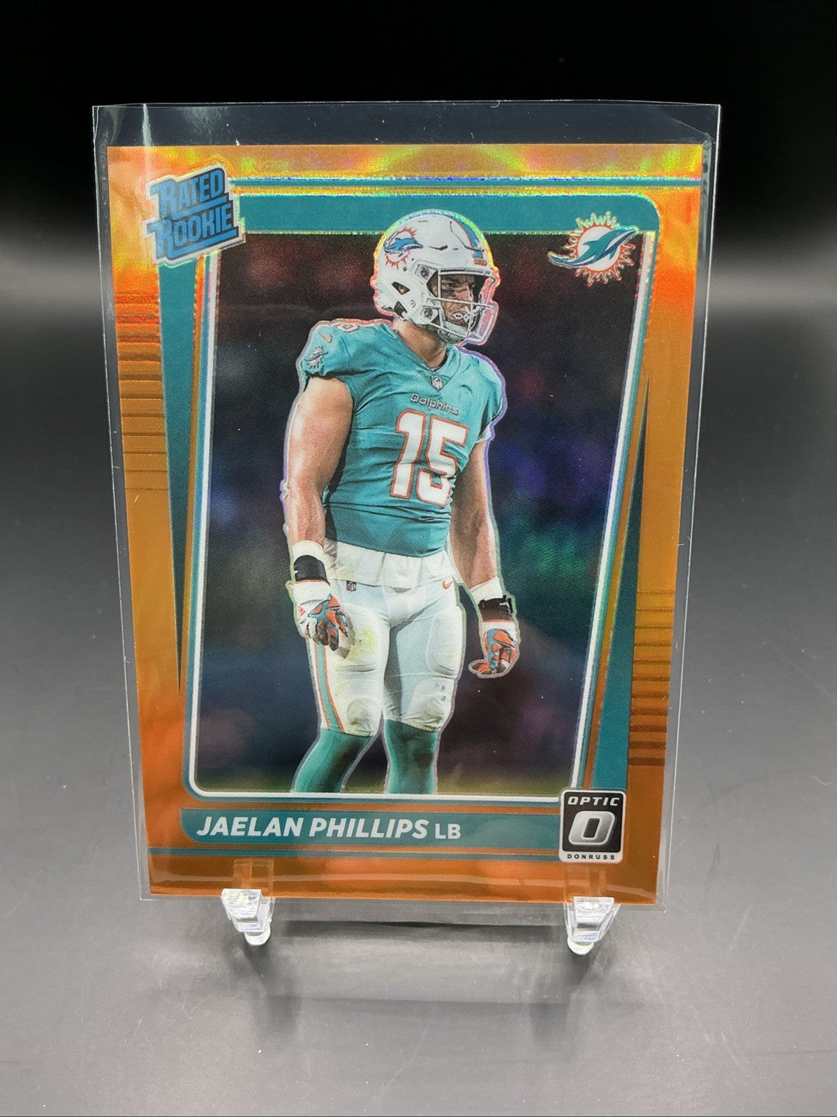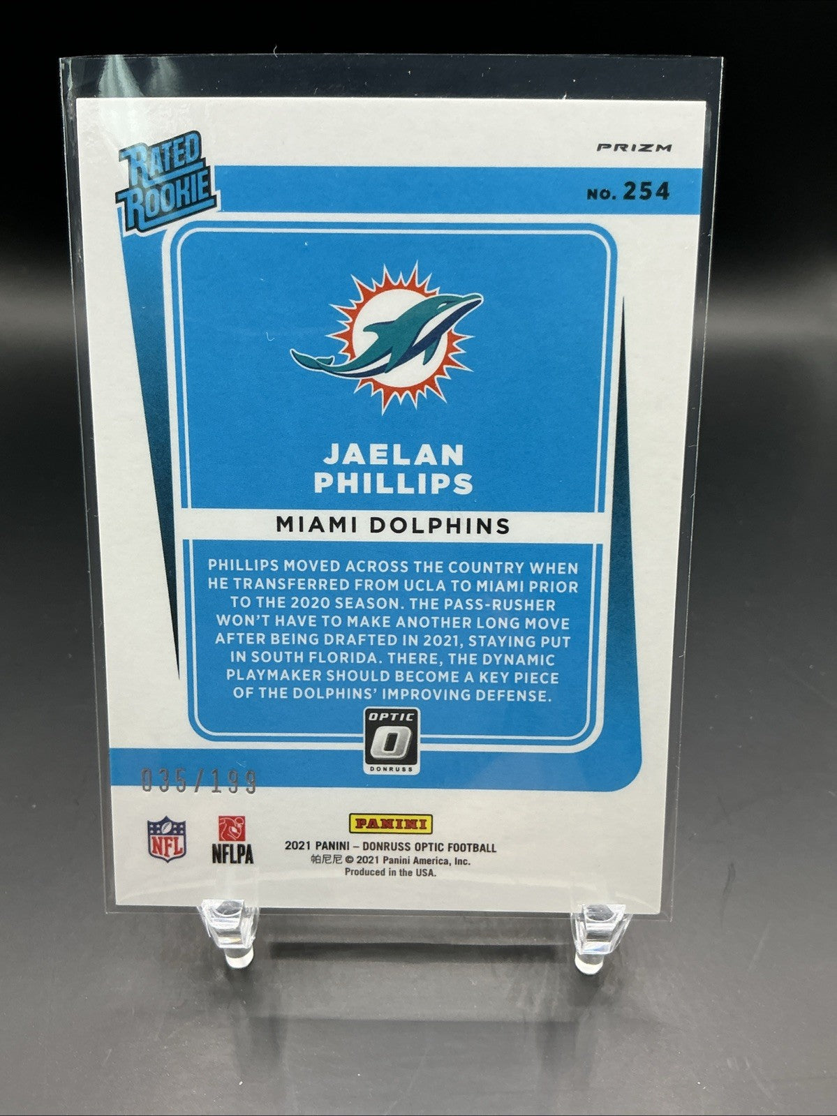 The 2021 Panini Donruss Optic Jaelan Phillips #254 Orange /199 trading card is a sought after collectible for football fans and card enthusiasts. This officially licensed NFL trading card features a unique Orange parallel variety, making it a standout addition to any collection. With a limited print run of only 199, this card is a valuable Rookie card for Jaelan Phillips of the Miami Dolphins, manufactured by Panini on high quality card stock. The serial numbering and Donruss authentication add to the authenticity and appeal of this promising young athlete's card.