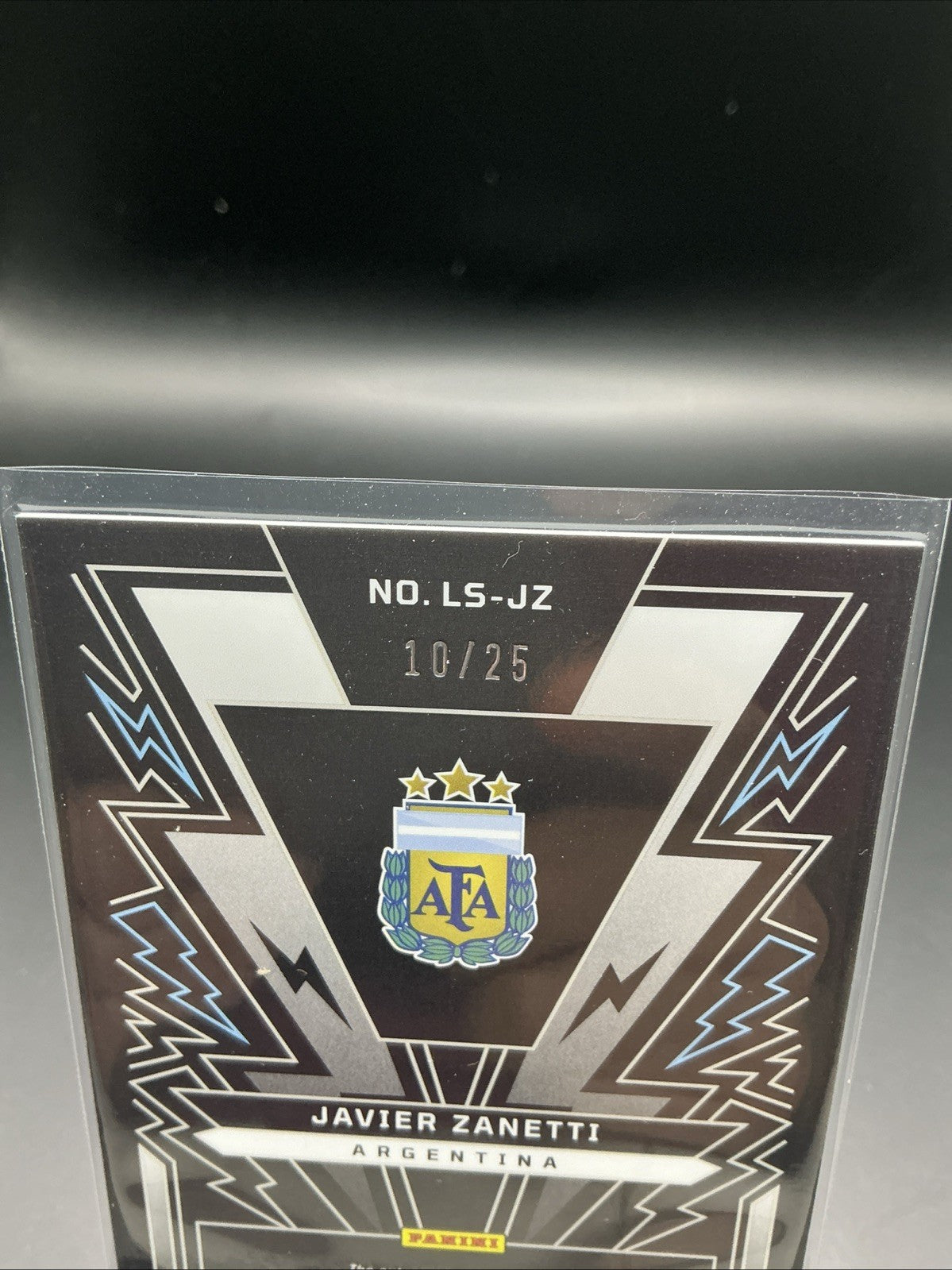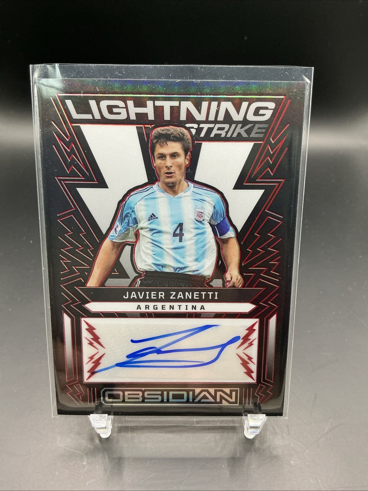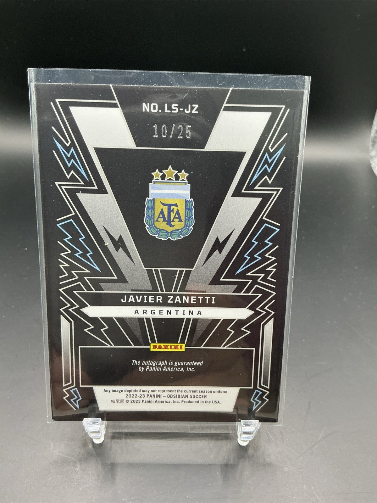 The product is a 2022-23 Panini Obsidian Javier Zanetti RED AUTO trading card, limited to only 25 copies as a super short print (SSP). This autographed card features Javier Zanetti, a legendary soccer player from Argentina, authenticated by Panini Authentic. Made of card stock and part of an original set, this sports trading card is a valuable collectible for fans of the FIFA World Cup and soccer in general. With its limited availability and unique red parallel variety, this card is sure to be a prized addition to any sports memorabilia collection.
