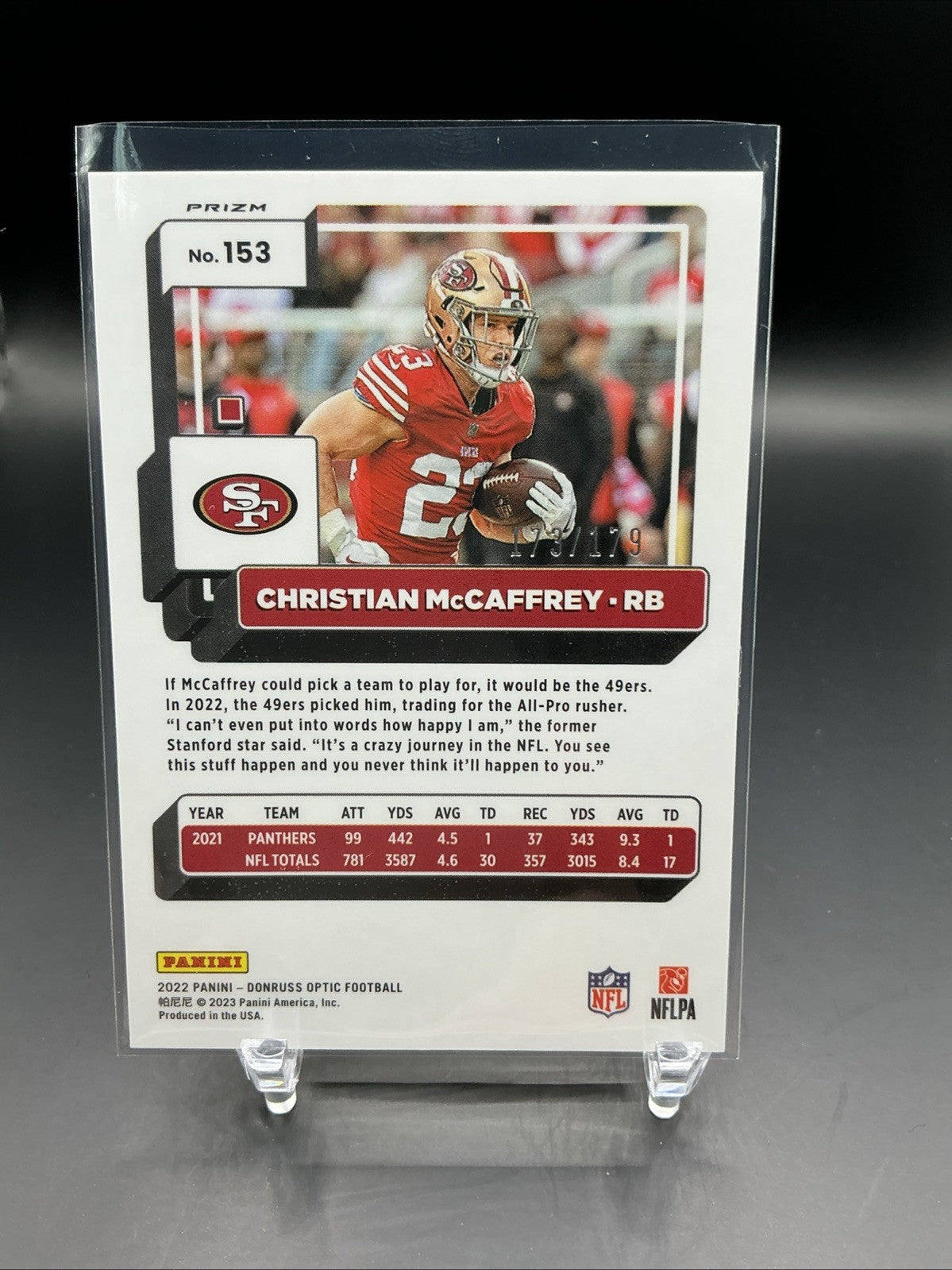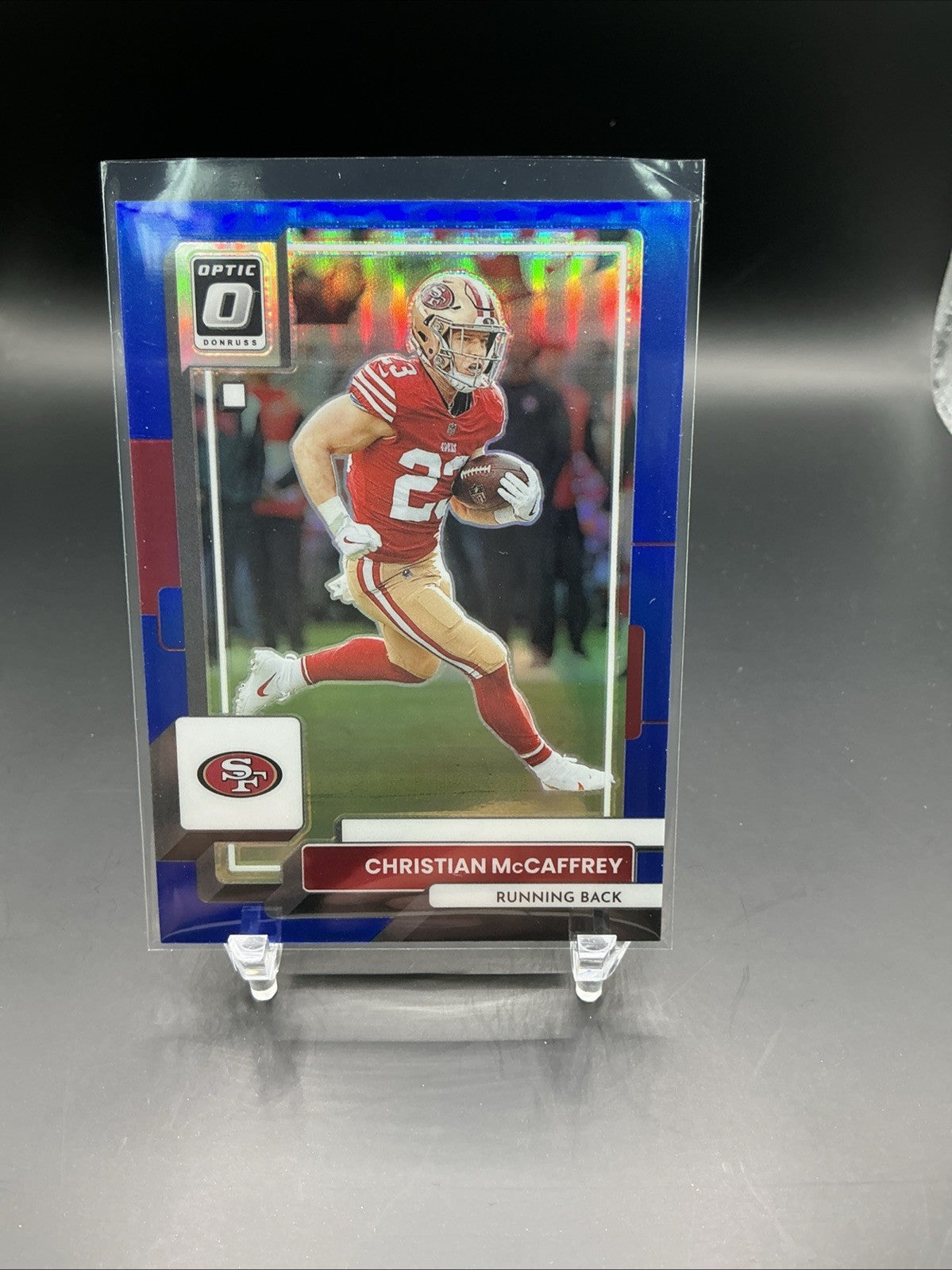 The 2022 Panini Optic Christian McCaffrey Blue /179 trading card is a highly sought-after collectible for fans of the National Football League (NFL). This rare card featuring the star player Christian McCaffrey is part of the 2022 Panini set, known for its Optic parallel variety. With only 179 cards produced, this limited edition item is a valuable addition to any sports trading card collection.