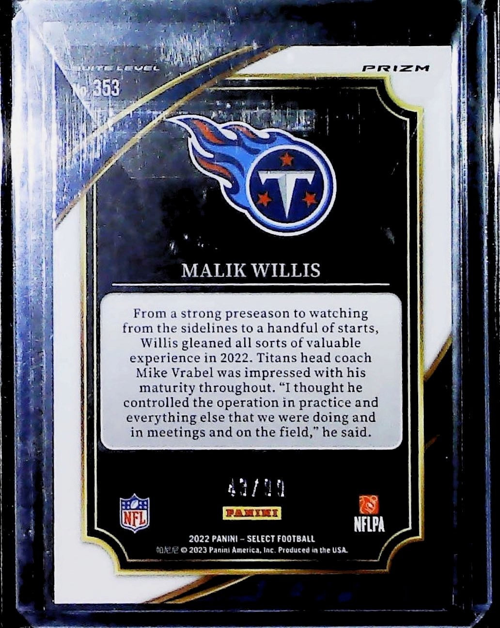 2022 Panini Select Football Malik Willis Rookie Blue Prizm Suite Level /99 RC