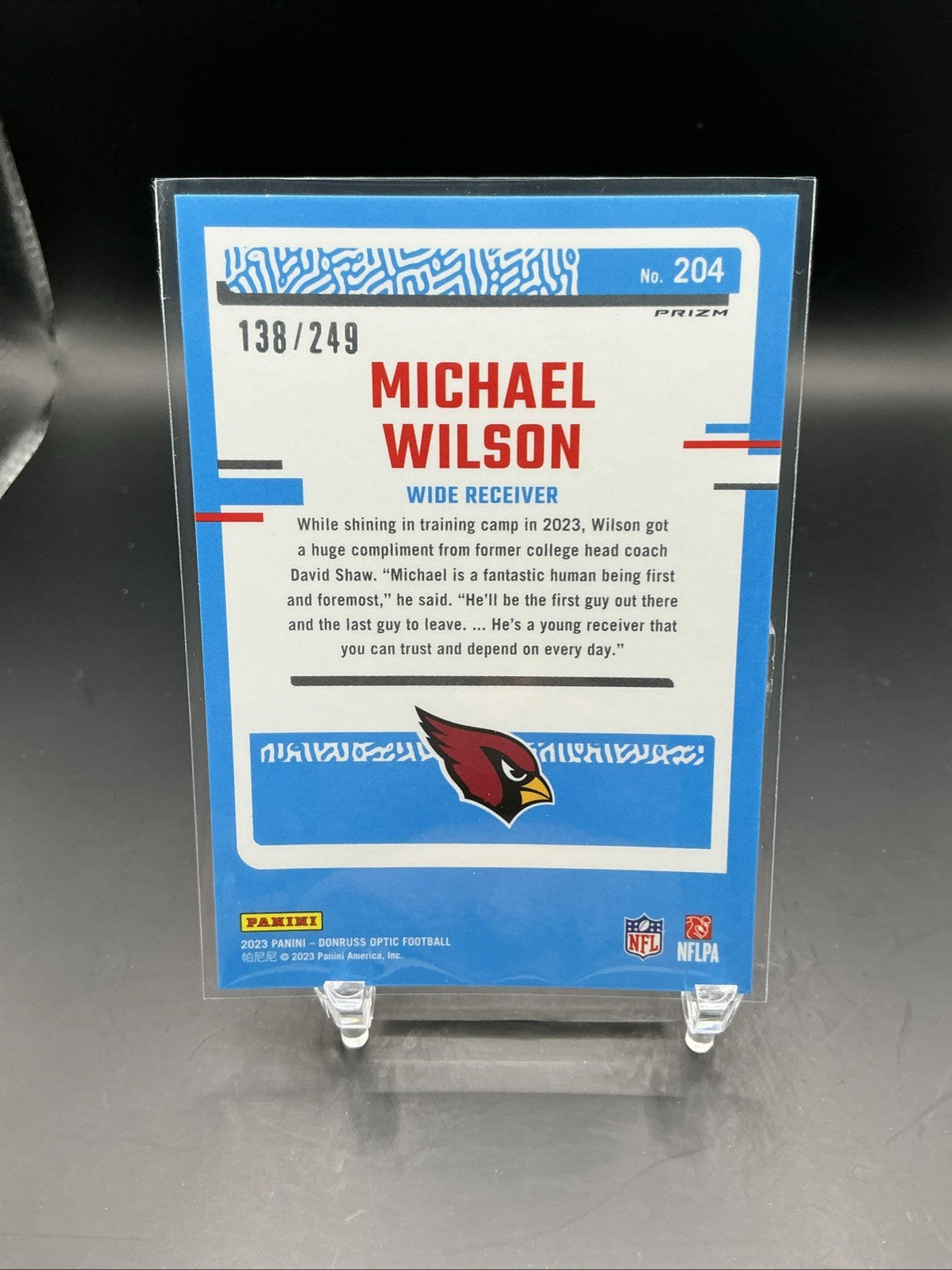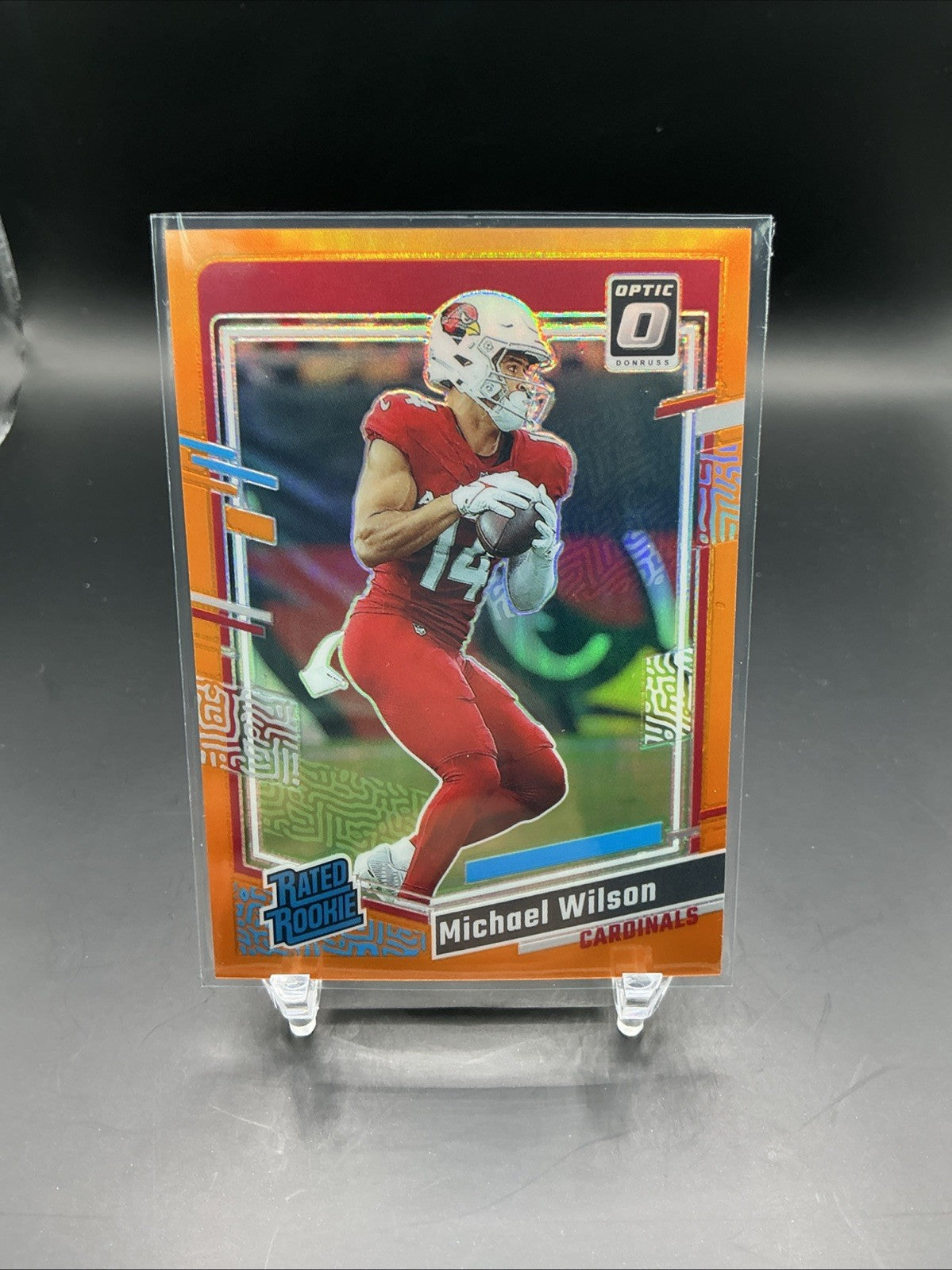 The 2023 Donruss Optic #204 Michael Wilson Orange Rookie trading card features Michael Wilson of the Arizona Cardinals. This original card is part of the Donruss Optic set for the 2023 football season and is serial numbered out of 249. Measuring 3½" x 2½", this sports trading card is a valuable addition to any football card collection. With its vibrant orange parallel variety and rookie designation, this card is sure to be a standout piece for fans of the Arizona Cardinals and collectors alike.