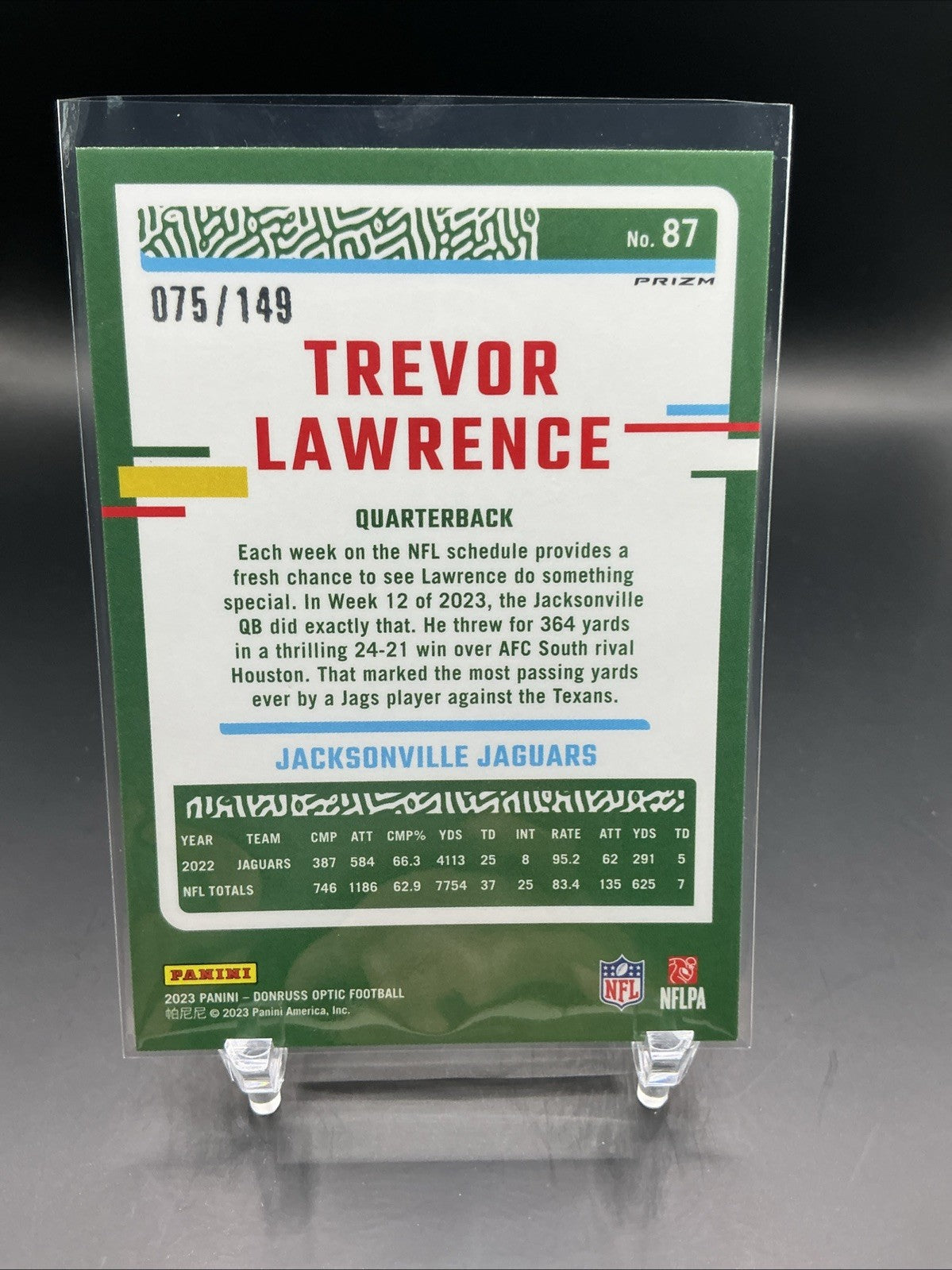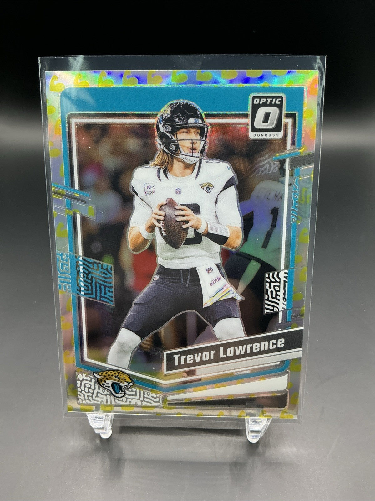 The 2023 Donruss Optic Trevor Lawrence Flex Emoji Prizm /149 trading card features the highly sought-after quarterback in a limited edition design. Manufactured by Panini, this collectible card is part of the Flex Emoji Prizm series, making it a unique addition to any football card collection. With its serial numbering and hologram features, this card is sure to be a prized possession for fans and collectors alike.