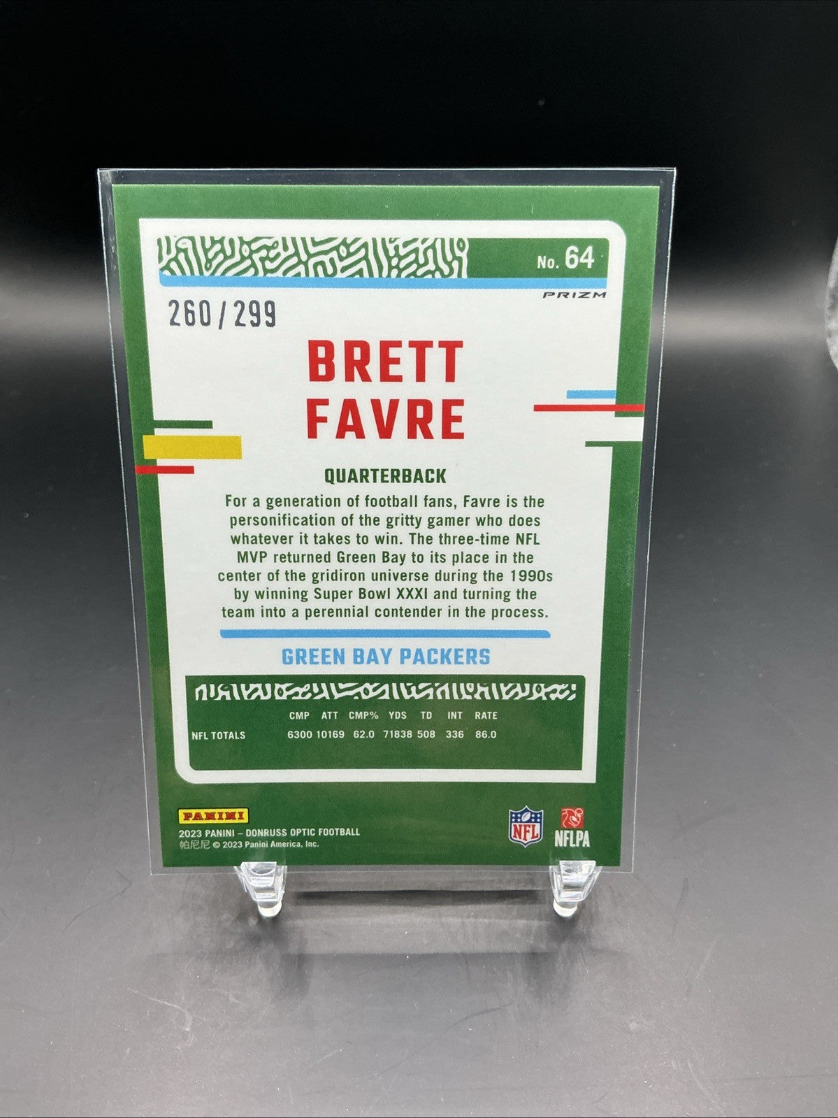 The 2023 Panini Donruss Optic Brett Favre Aqua Prizm /299 trading card featuring the legendary Green Bay Packers quarterback is a highly sought-after collectible for football fans and card enthusiasts. This limited edition card, numbered out of 299, showcases a unique Aqua Prizm parallel design that adds a special touch to any collection. With features like being serial numbered, part of an exclusive collectors' edition, and an insert in the set, this card offers a chance for fans to own a piece of NFL history with Brett Favre.