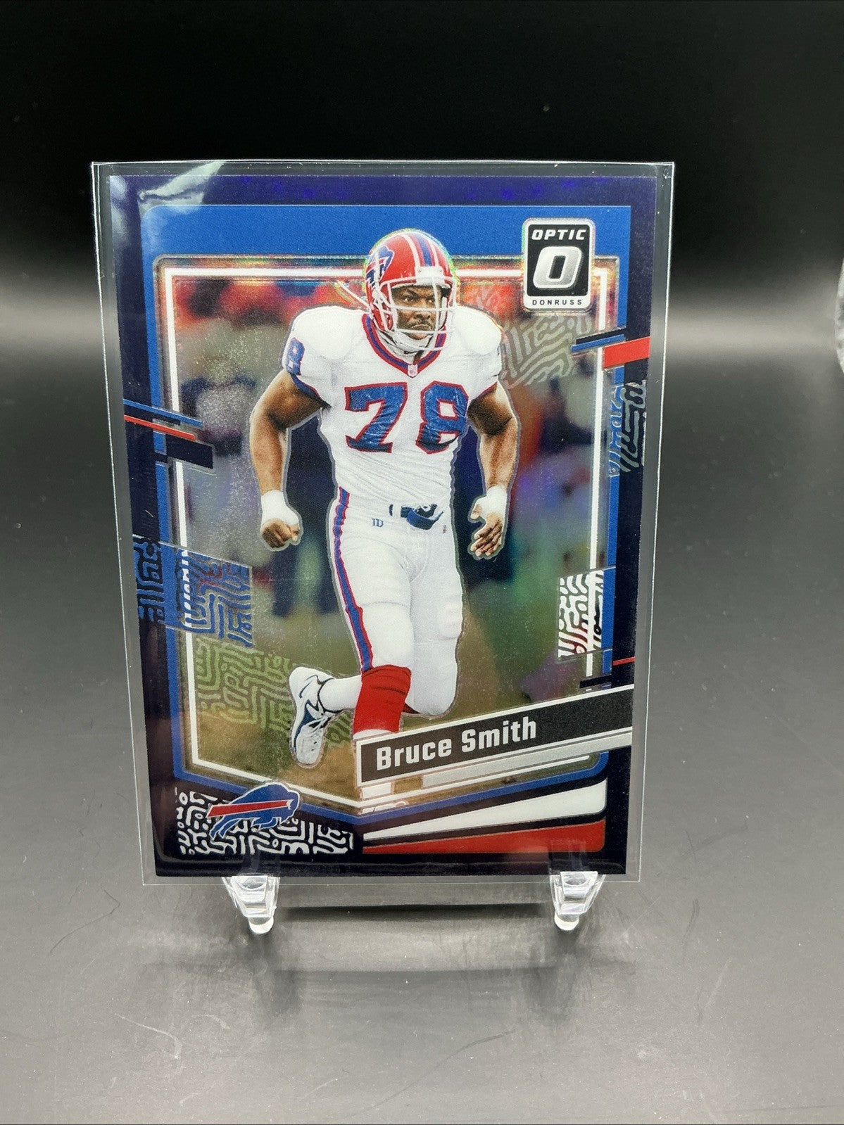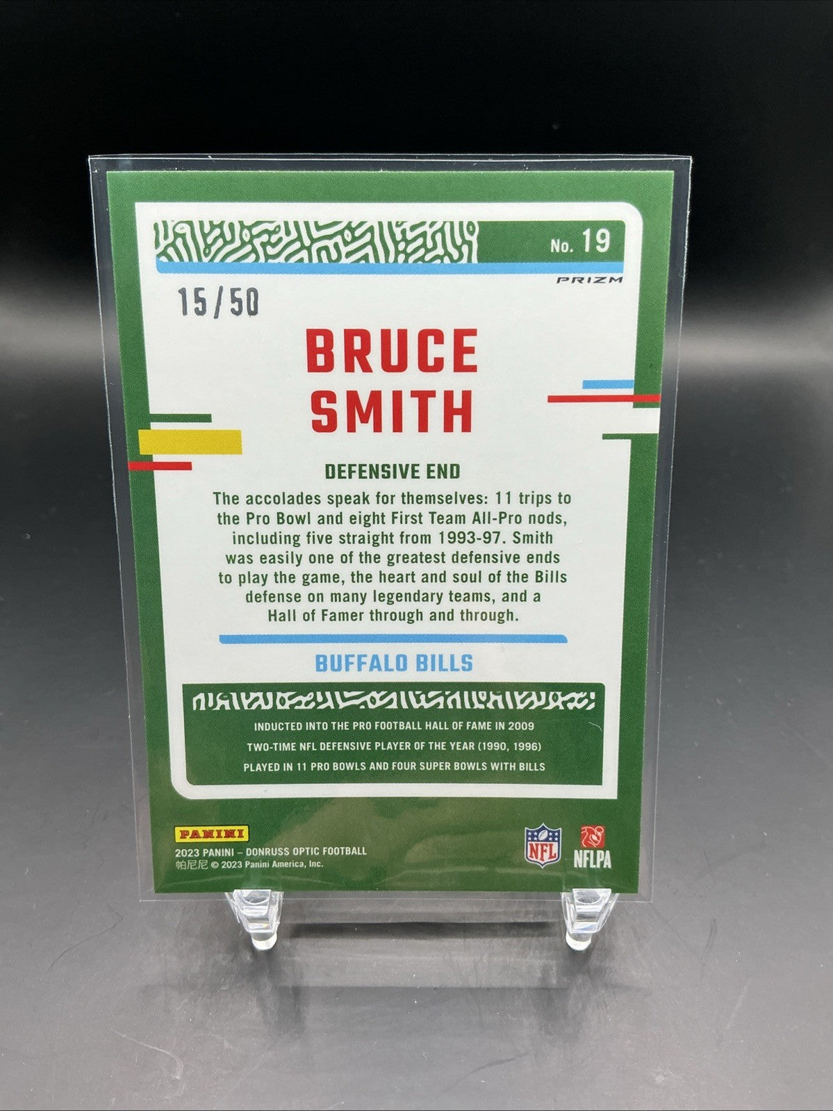 The product is a 2023 Panini Donruss Optic trading card featuring football player Bruce Smith from the Buffalo Bills. This particular card is a Purple Prizm parallel, numbered #19 out of 50, adding rarity and collectibility to the item. As a part of the National Football League (NFL) series by Panini, this card offers fans and collectors a unique and limited edition piece to add to their collection of sports trading cards.