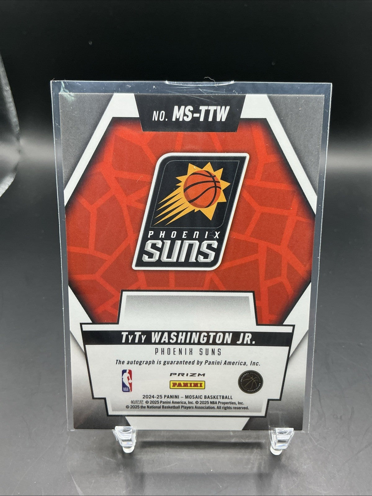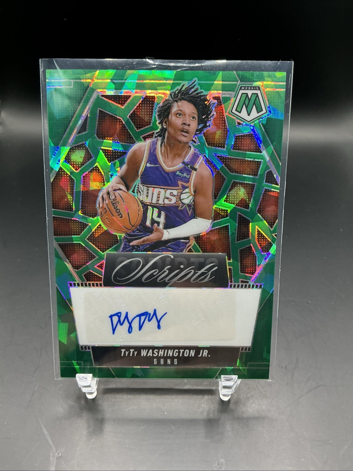 The product is a 2024-25 Panini Mosaic Green Prizm Scripts auto trading card featuring Ty Ty Washington of the Phoenix Suns. The card is autographed by Washington with a label or sticker and is authenticated by Panini Authentic. This rare, short print card is made of card stock and is an original, licensed reprint, not a vintage piece. The card is part of the 2024-25 NBA season and is in English language, making it a valuable addition to any basketball card collection.