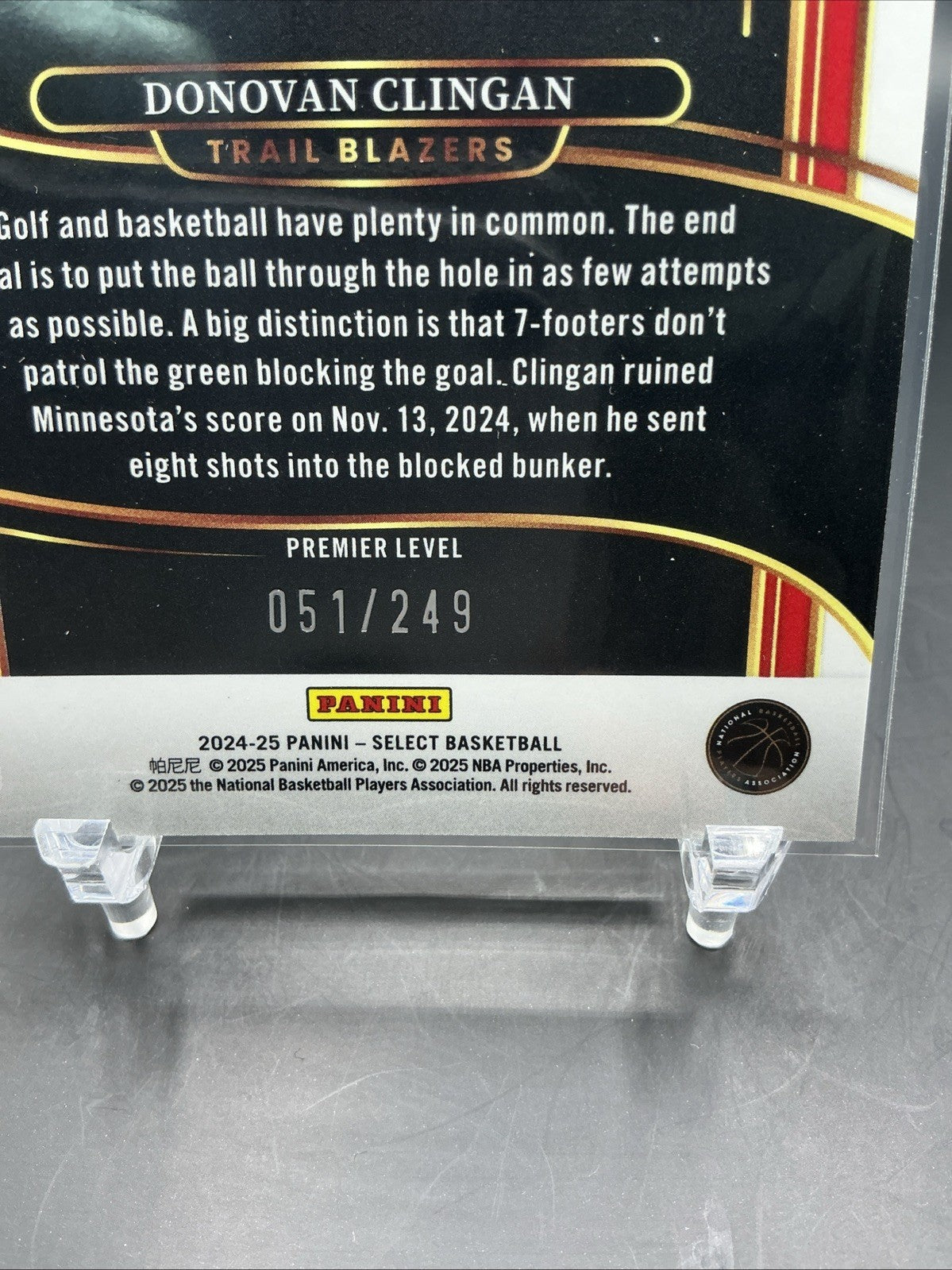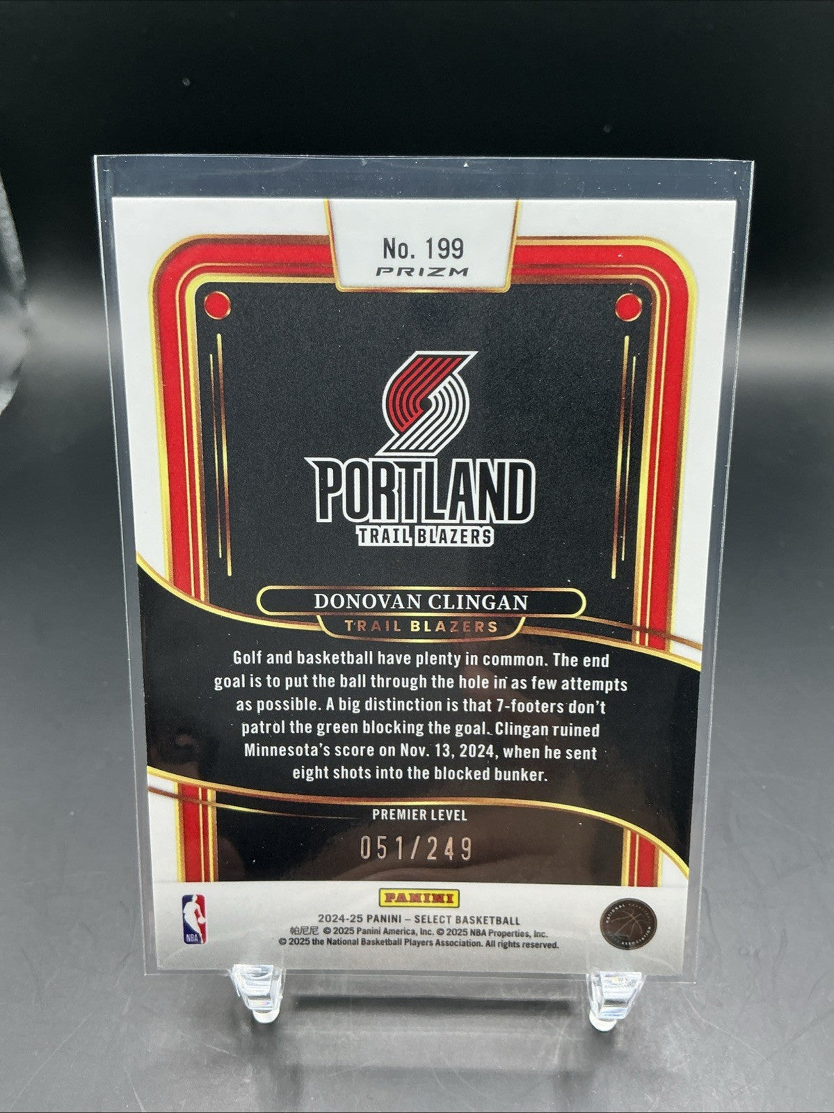 The product is a 2024-25 Panini Select trading card featuring basketball player Donovan Clingan. This specific card is a rookie premier red scope parallel with a card number of 199. Panini is the manufacturer, and the set is from the 2024-25 season. As a sports trading card, this item is a collectible piece for fans and collectors of basketball memorabilia. The red scope parallel adds a unique and desirable element to the card, making it a valuable addition to any trading card collection.