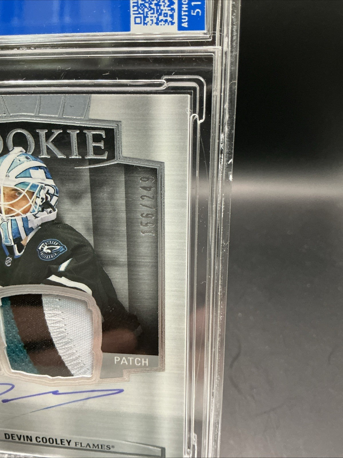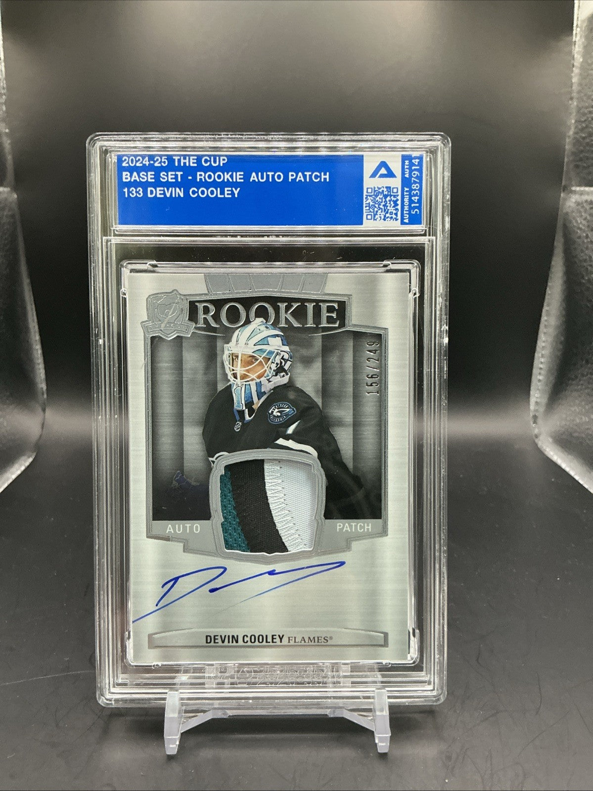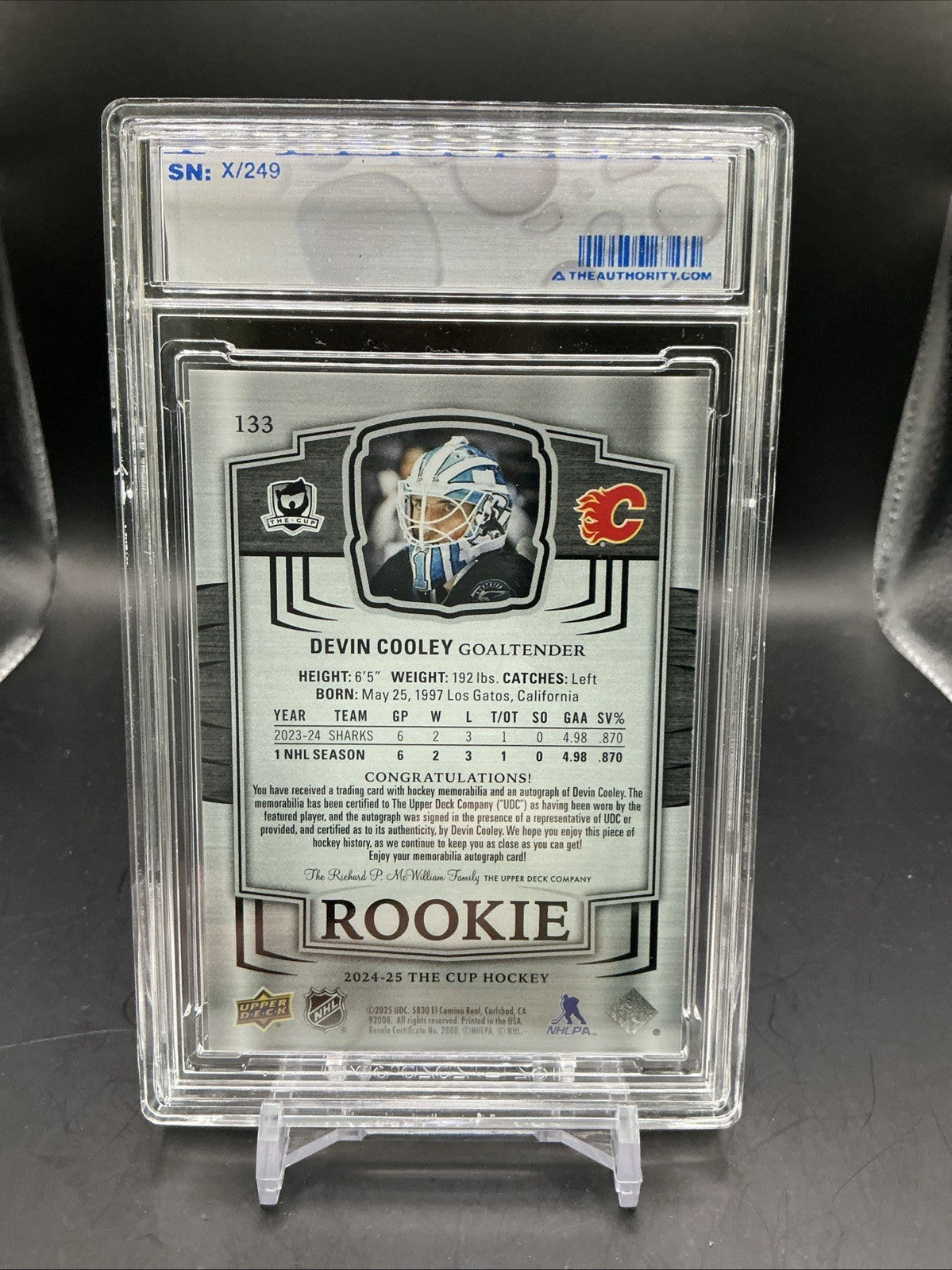 The product is a 2024-25 The Cup #133 Devin Cooley ROOKIE 3 COLOR PATCH AUTO /249 RC RPA trading card from Upper Deck. This sports trading card features a patch, autograph, memorabilia, and is serial numbered as an RPA. It is a highly sought-after collectible for fans of ice hockey and collectors looking for rookie cards with unique features. The card is an original release, making it a valuable addition to any sports memorabilia collection.