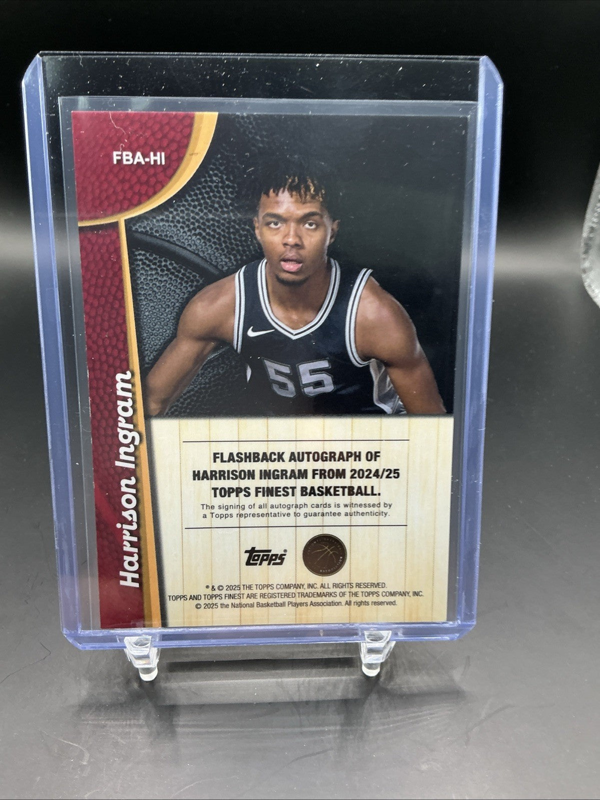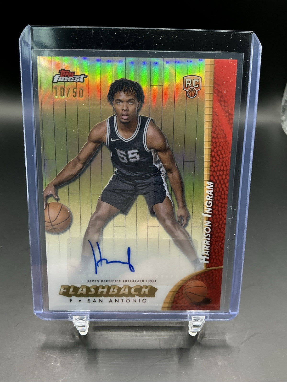 The product is a 2024-25 Topps Finest trading card featuring a gold parallel with a /50 autograph of rookie player Harrison Ingram from the San Antonio Spurs. This card is an original release by Topps and is authenticated by the manufacturer. It is part of the NBA set for the 2024 season and is made of card stock. The autograph is in label or sticker format, and the card is produced in English language in the United States. This limited edition card is a valuable collectible for basketball fans and card collectors.