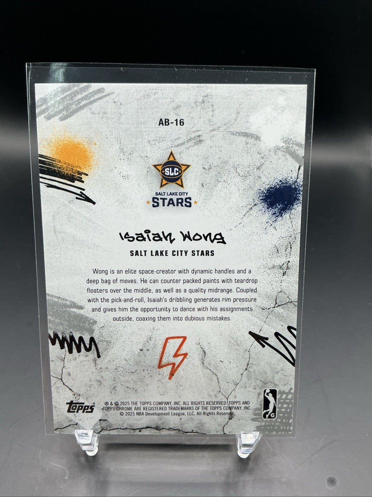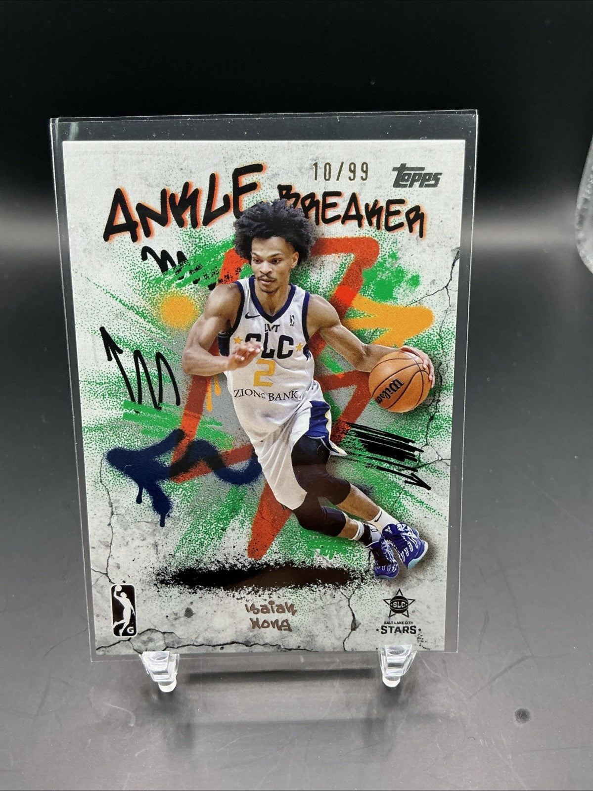 The product is a 2024-25 Topps G League Ankle Breaker Green trading card featuring Isaiah Wong. This single card is serial numbered out of 99 and belongs to the modern era of basketball trading cards. Manufactured by Topps, the card is part of the Ankle Breaker set for the 2024-25 season, making it a valuable addition to any basketball card collection. With its limited edition green parallel variety, this original card showcases the young athlete Isaiah Wong in the G League.