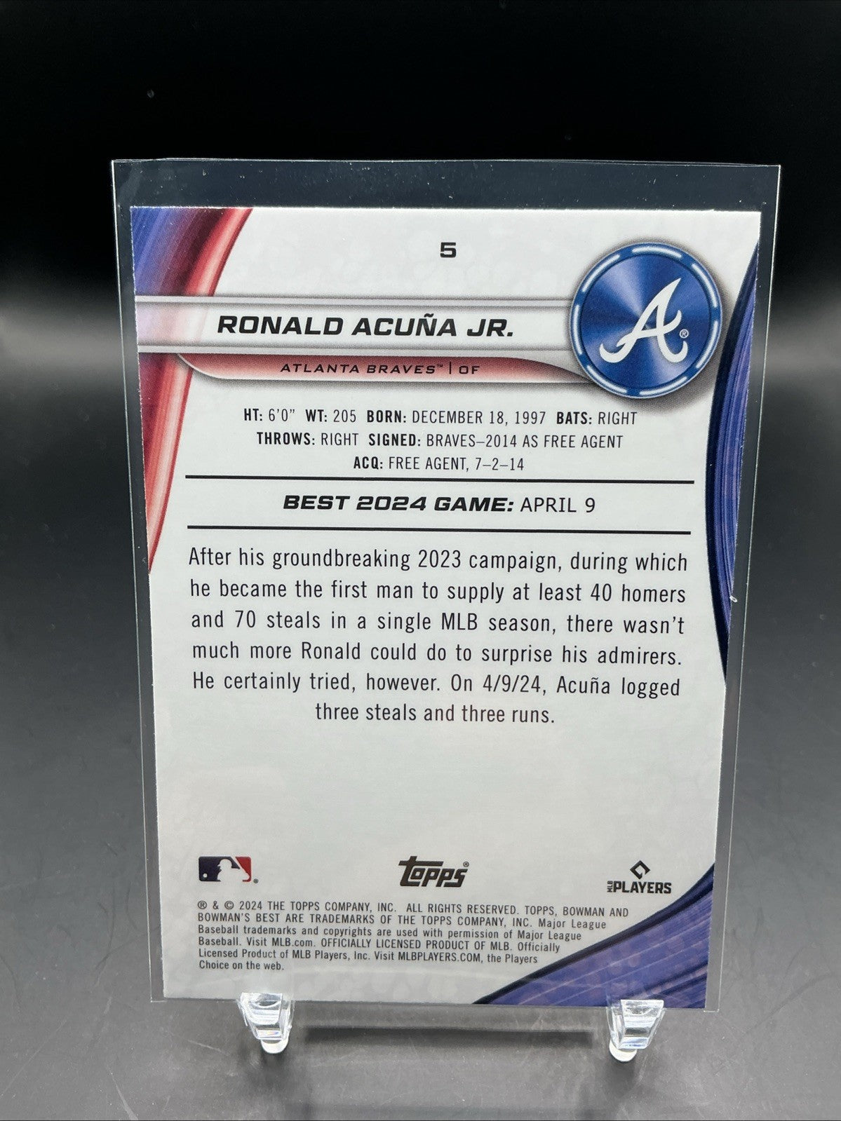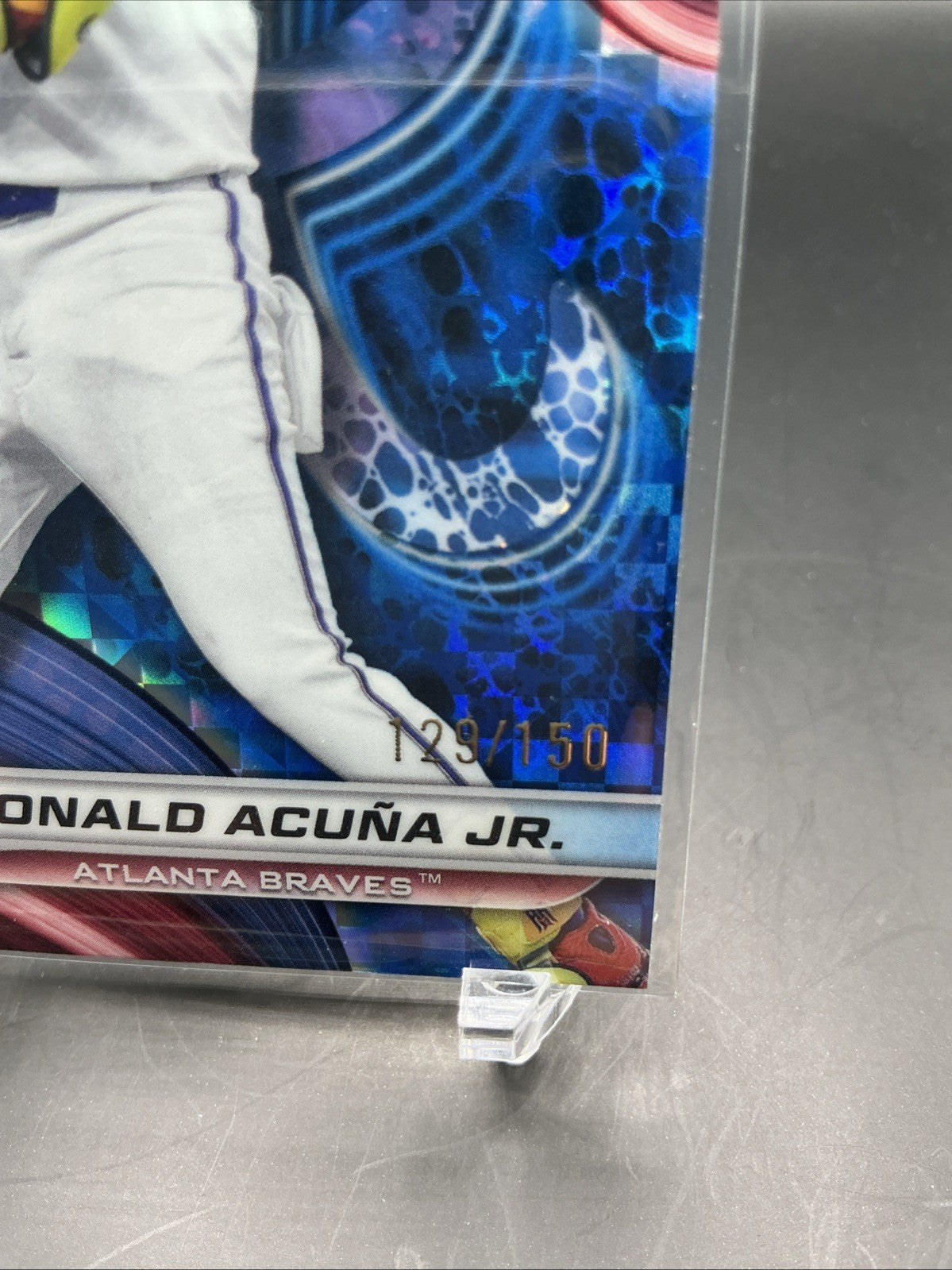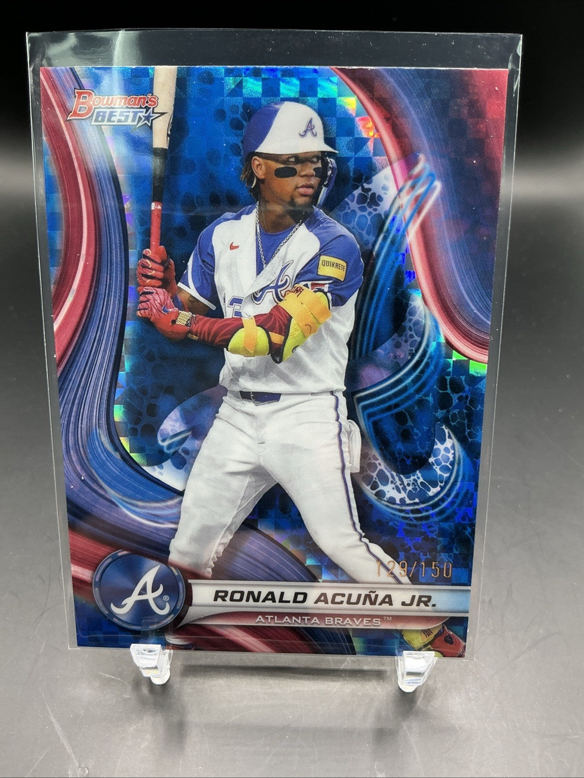 The product is a 2024 Bowman's Best Ronald Acuna Jr. Blue Checker Refractor trading card, numbered out of 150, featuring the Atlanta Braves player. This original card is made of card stock with a 35 Pt. thickness, and is part of the Blue Refractor insert set. manufactured by Topps, this baseball trading card is a parallel variety that is serial numbered and comes in English language. It is a valuable collectible item for fans of Major League Baseball and collectors of sports trading cards.