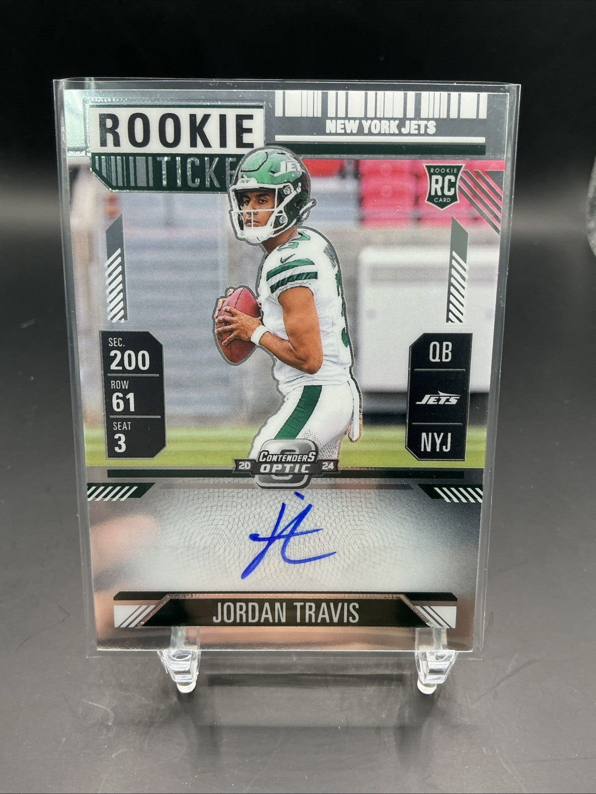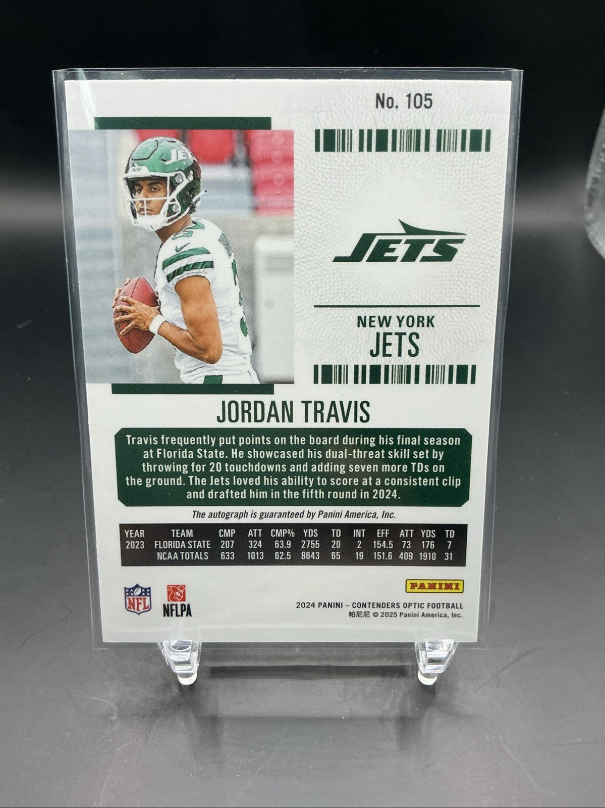 The product is a 2024 Contenders Optic trading card featuring rookie autograph of Jordan Travis from the New York Jets. This standard-sized card is hard signed by the player and authenticated by Panini Authentic. It is part of the 2024 Panini Contenders Optic set and belongs to the Rookie Ticket RPS Autographs parallel/variety. The card is manufactured in the United States on card stock material and is an original release, making it a valuable addition to any football trading card collection.