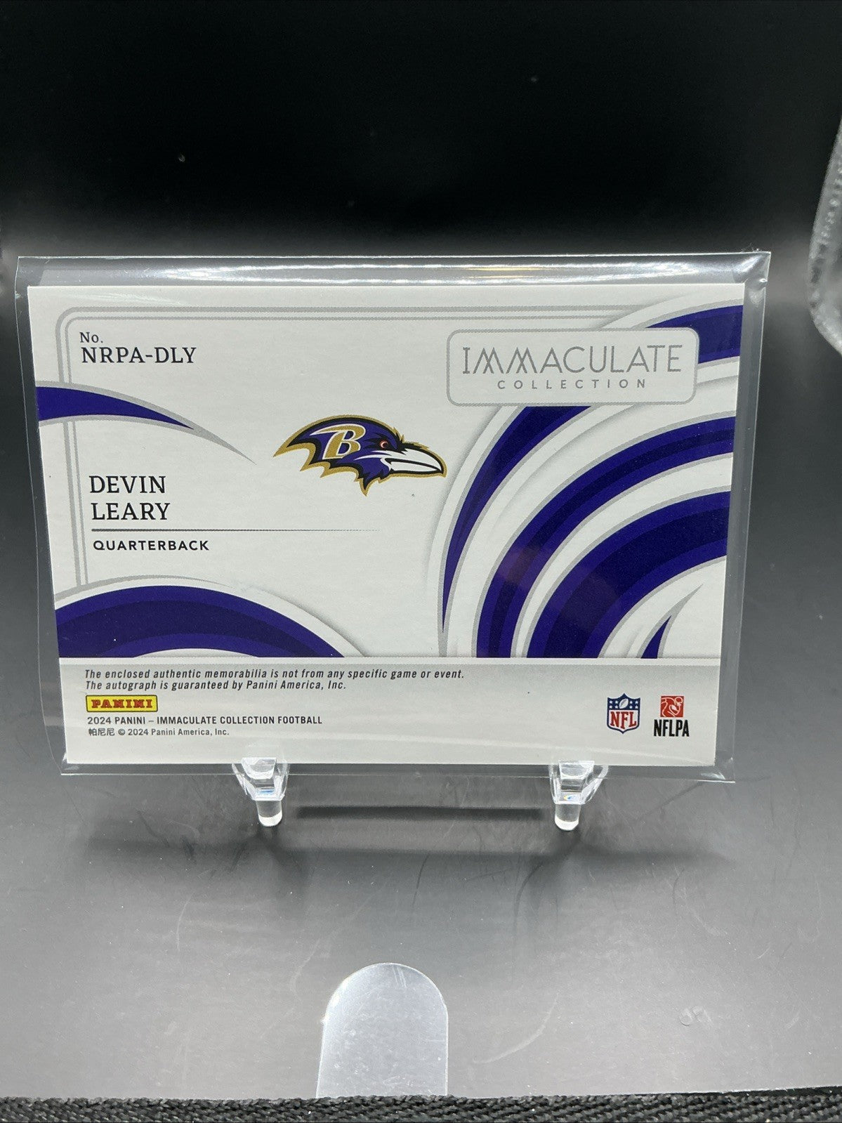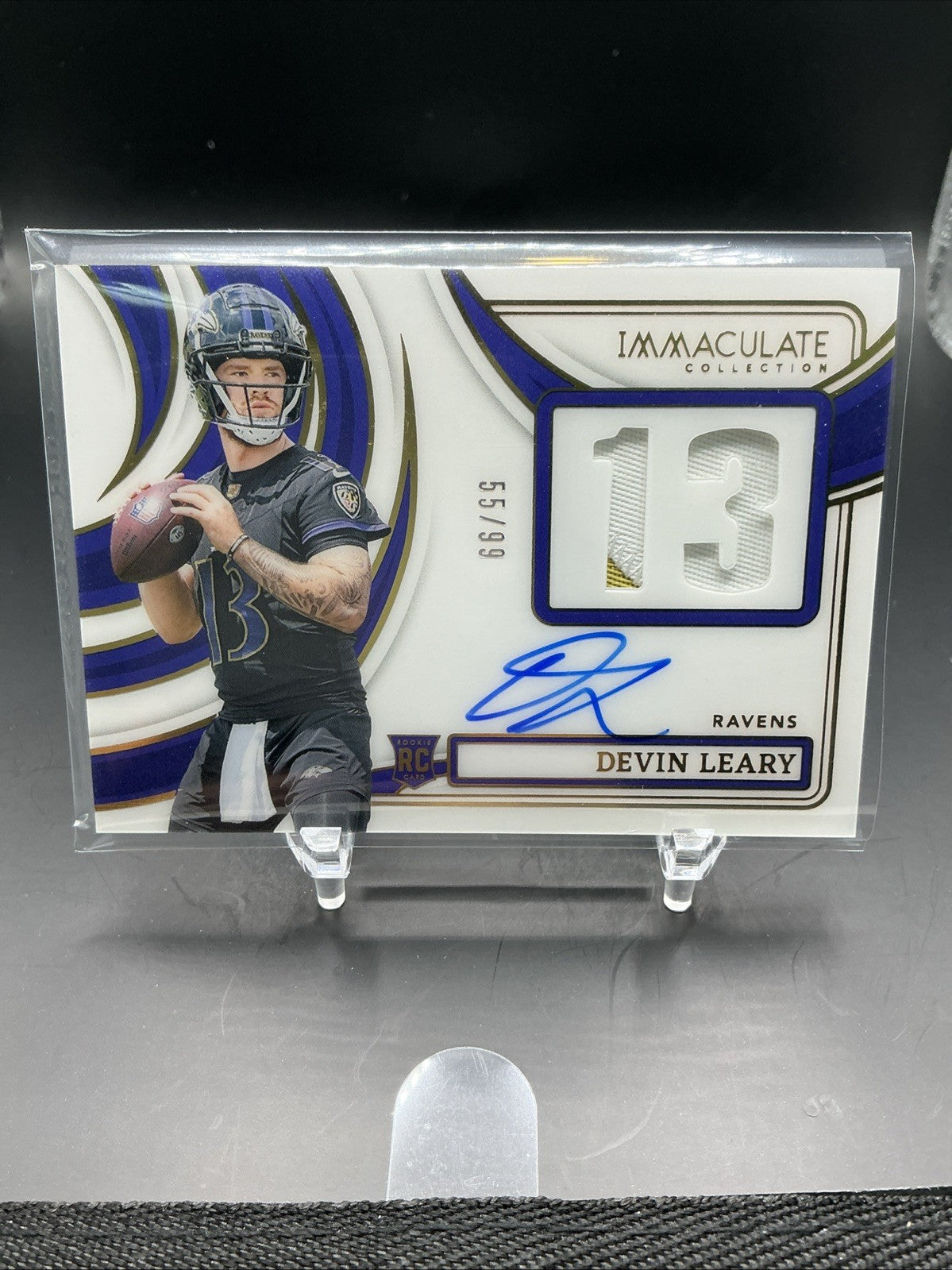 The product is a 2024 Panini Immaculate Devin Leary Numbers Rookie Patch Auto trading card, featuring a patch of the player's jersey and his autograph, limited to only 99 copies. This football card is part of the 2024 Panini set and showcases Devin Leary as a rookie player, making it a valuable addition to any sports trading card collection. This card combines the best of both worlds, offering a rare and collectible item for fans of the sport and the player.