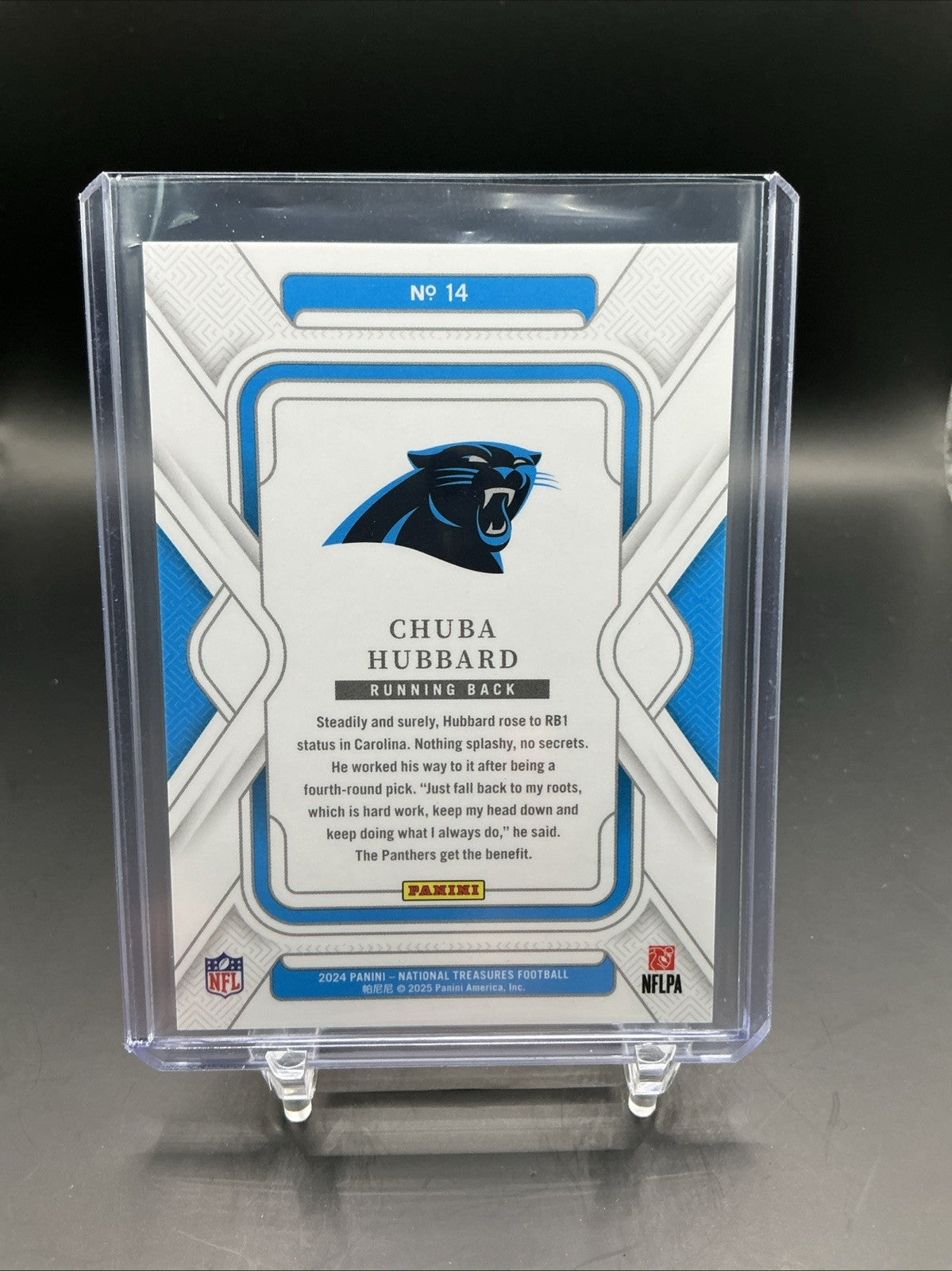 The product is a 2024 Panini National Treasures Purple Chuba Hubbard trading card numbered to only 75 copies. This collectible item features the football player Chuba Hubbard and is part of the National Treasures set by Panini, known for its high-quality and limited edition cards. The card is in English and includes features such as being serial numbered, making it a sought-after piece for fans and collectors alike.
