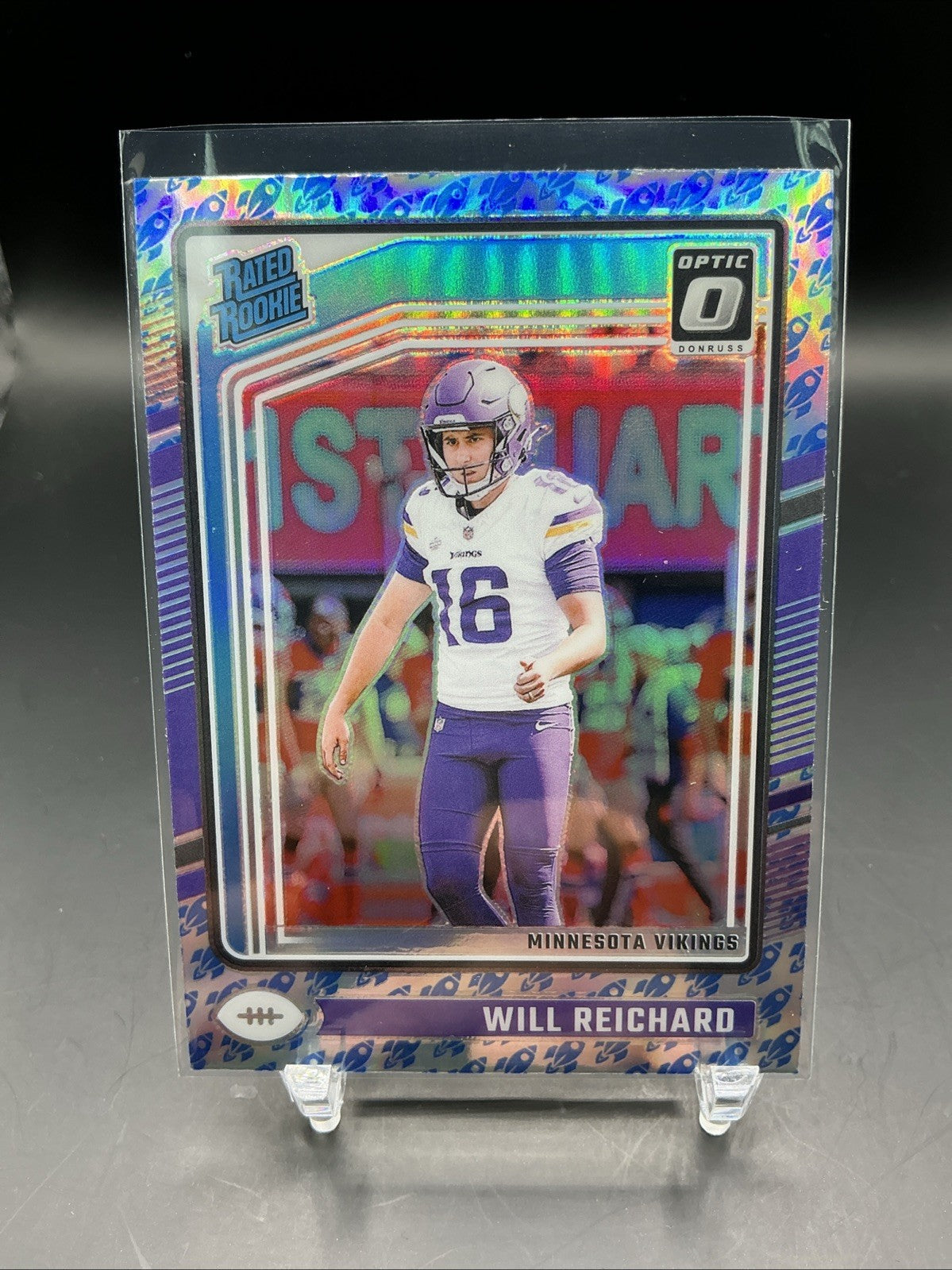 The product is a 2024 Panini Optic Will Reichard #297 RC Rated Rookie trading card featuring the Minnesota Vikings. This sports trading card is part of the 2024 Panini Donruss set and is made of card stock. The card does not feature an autograph, but it is a special parallel variety with a rocket emoji design, making it a rare SSP (Super Short Print) rookie card. This collectible item is perfect for fans of football and trading cards looking to add a unique piece to their collection.