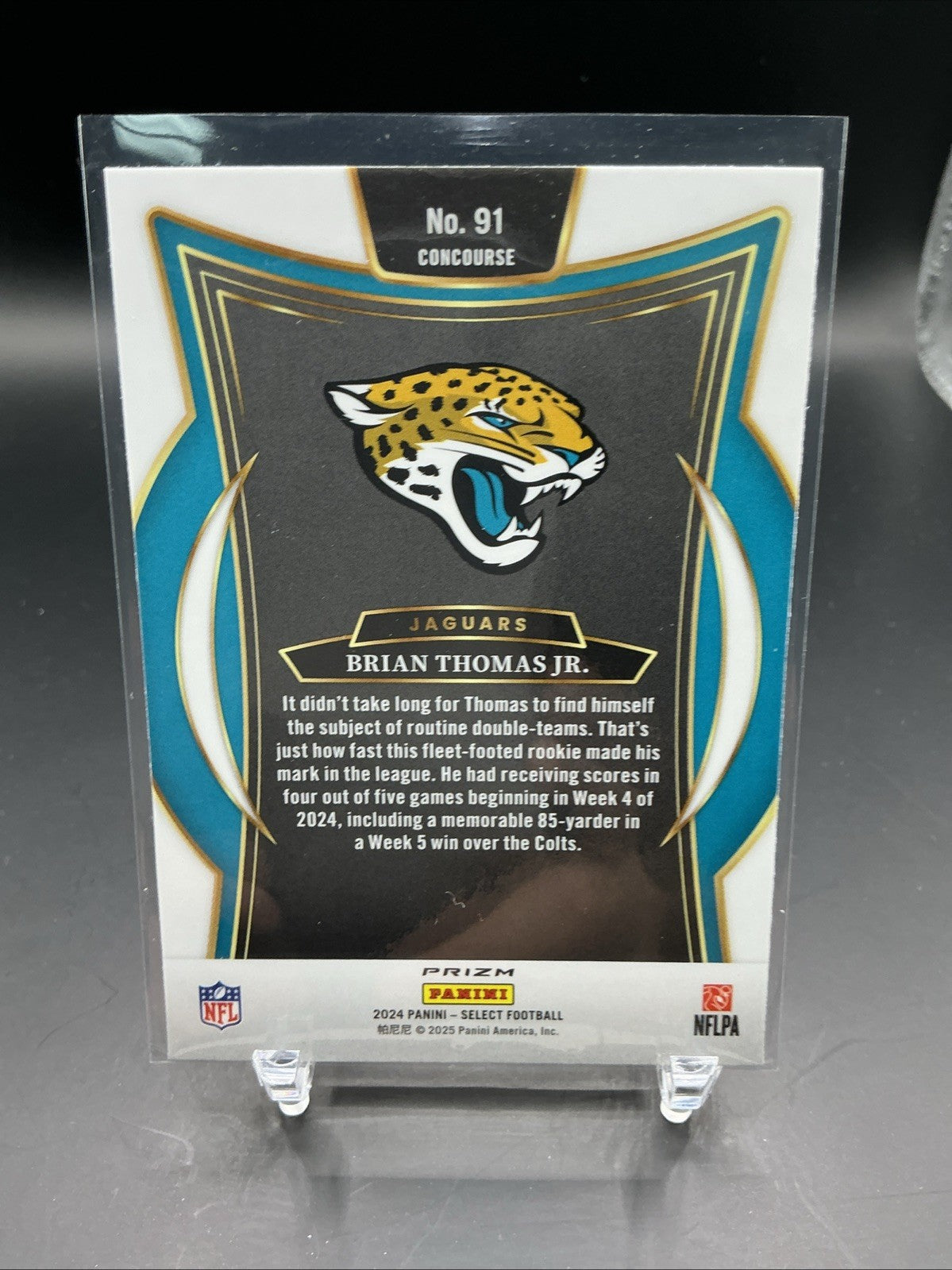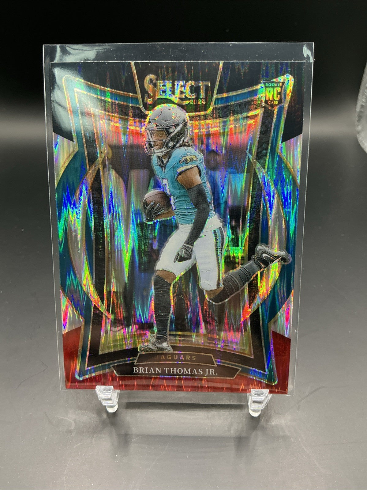 The product is a 2024 Topps Brian Thomas Jr. Black Red Shock Rookie trading card, featuring a Purple Refractor parallel. This sports trading card is specific to football and is part of the 2024 Topps set. As a rookie card, it holds special significance for collectors looking to acquire cards of up-and-coming players like Brian Thomas Jr.