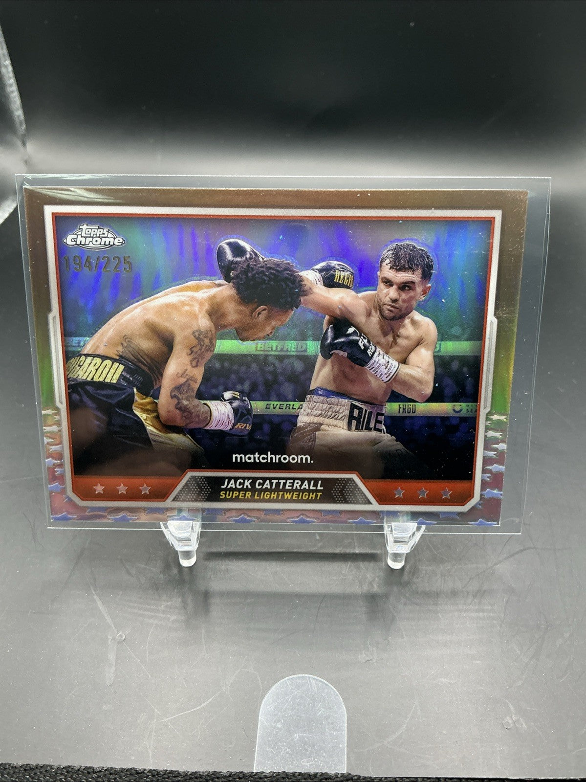The product is a 2024 Topps Chrome Boxing trading card featuring Jack Catterall, with a Bronze Refractor parallel limited to 225 copies. Produced by Topps, this sports trading card is part of the 2024 Topps Chrome set, focusing on the world of boxing. With a card number of 82, collectors can add this unique and limited edition card to their sports trading card collection for a special piece of boxing memorabilia.