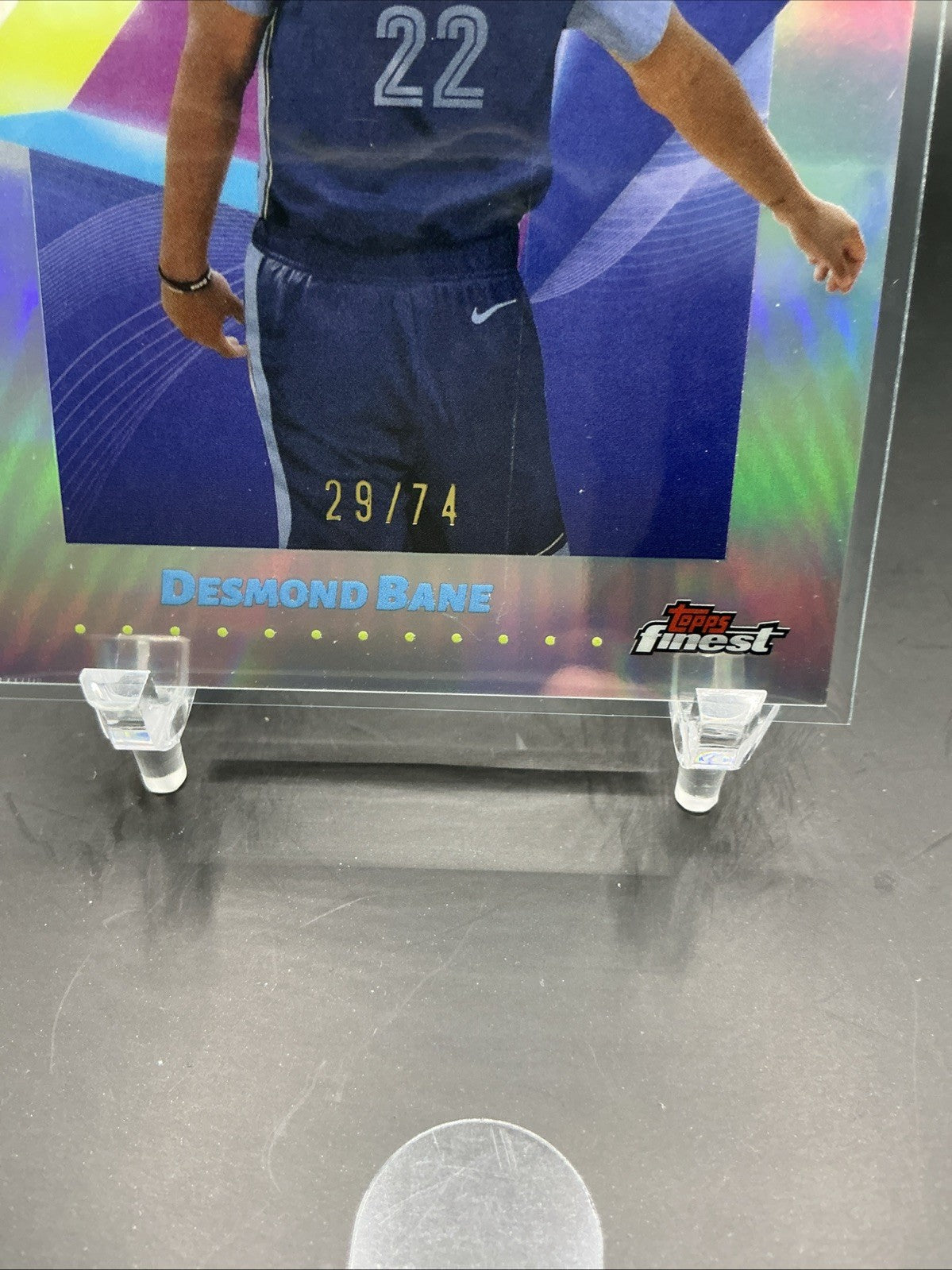 The product is a 2024 Topps Finest Desmond Bane die-cut refractor trading card, numbered to 74. Manufactured by Topps, this basketball card features a refractor design, adding a shiny and collectible element to the card. With a focus on the player Desmond Bane, this limited edition card is a sought-after item for sports card enthusiasts and fans of the basketball season of 2024.
