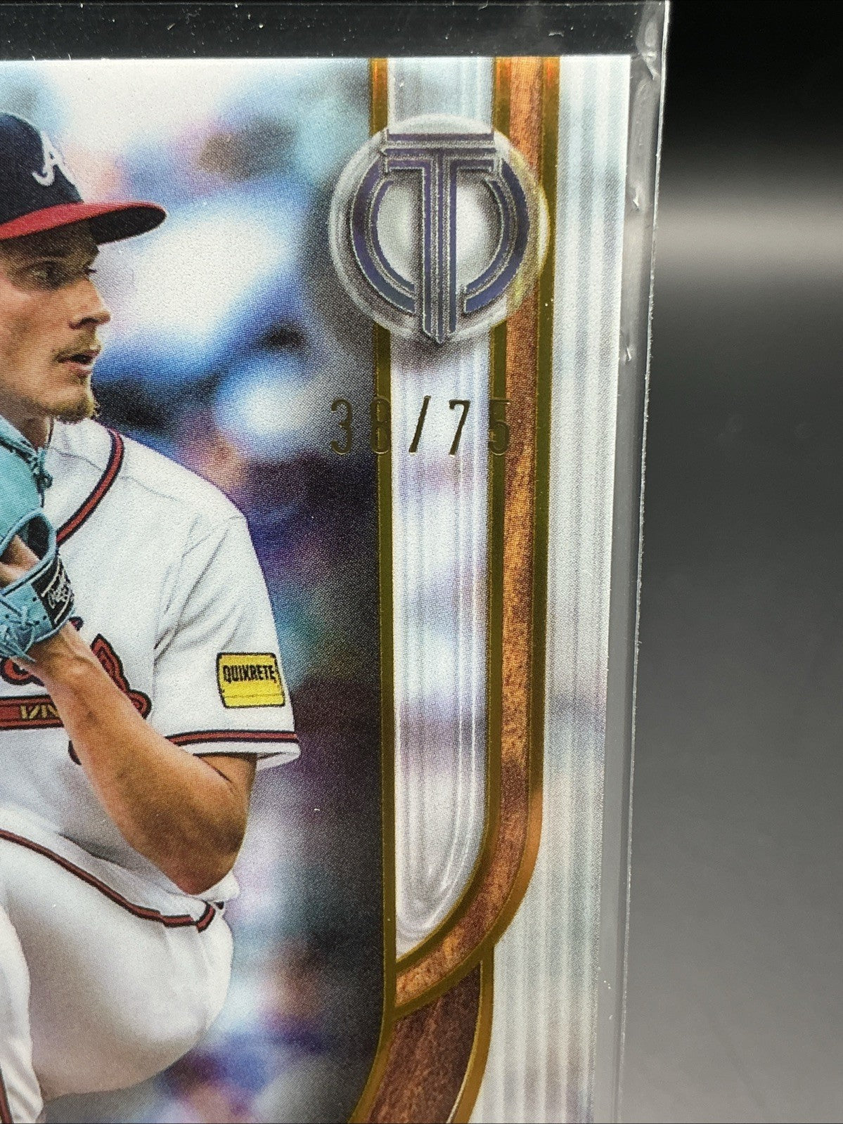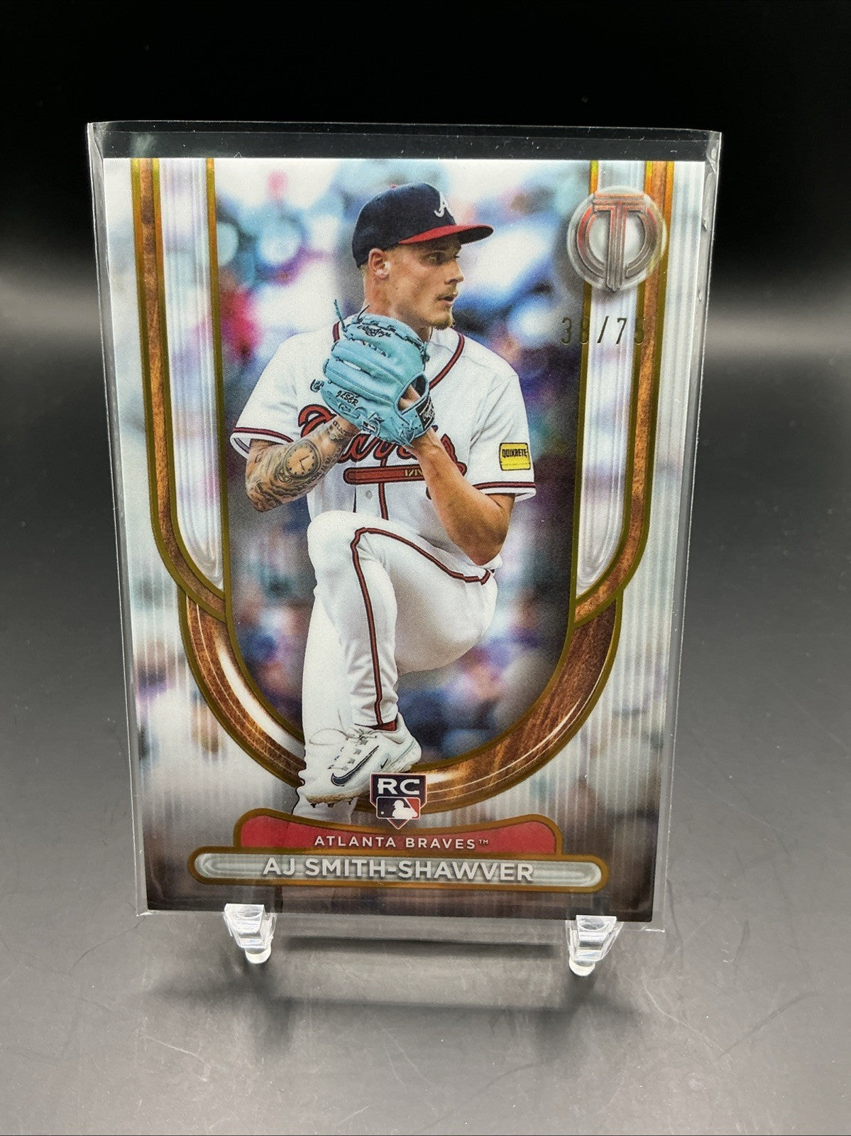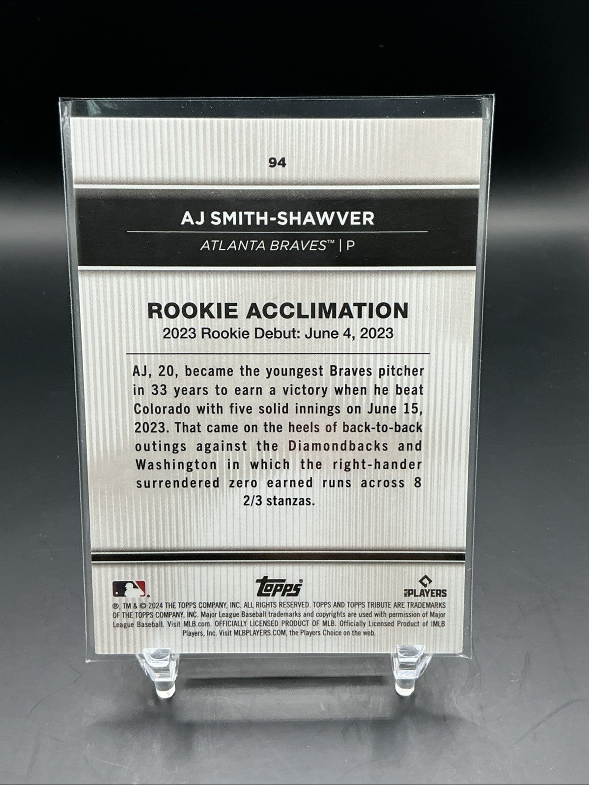 The product is a 2024 Topps Tribute trading card featuring rookie player AJ Smith-Shawver from the Atlanta Braves. This limited edition card is numbered out of 75 and is a part of the base set for the 2024 season. As a sports trading card manufacturer, Topps is known for producing high-quality and collectible cards for baseball fans, like this one showcasing a promising rookie player for the Braves.