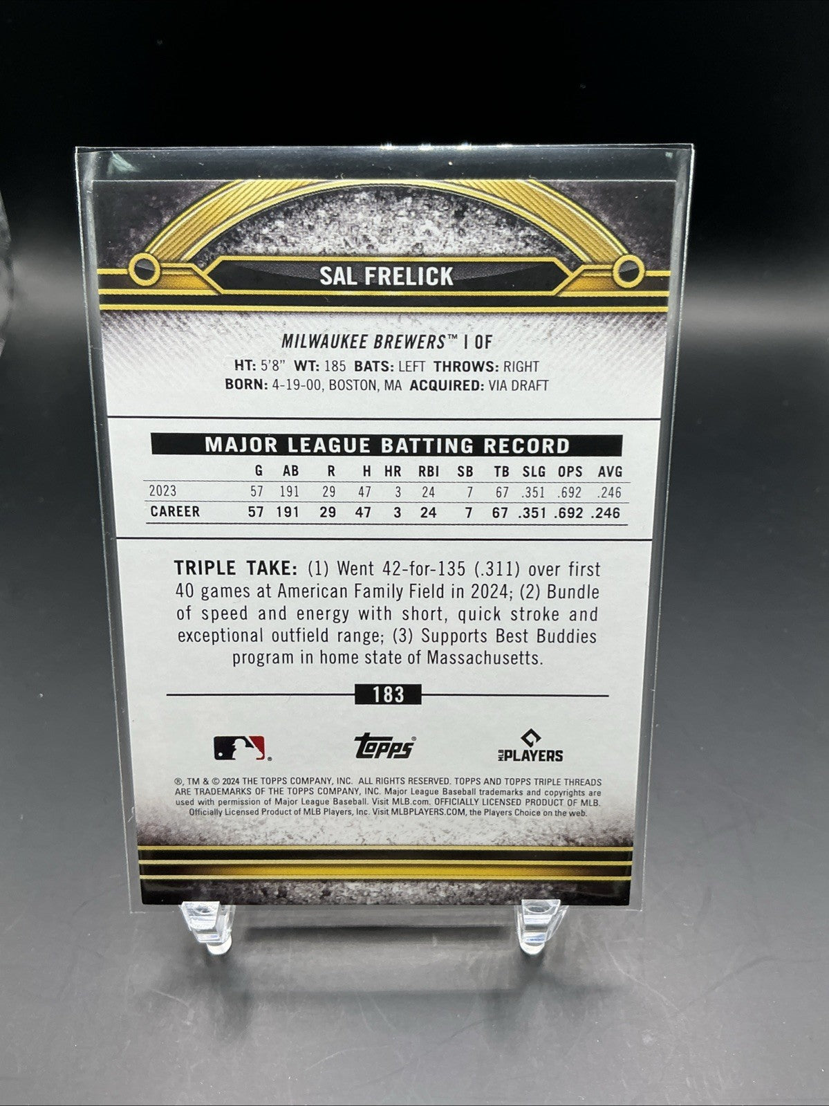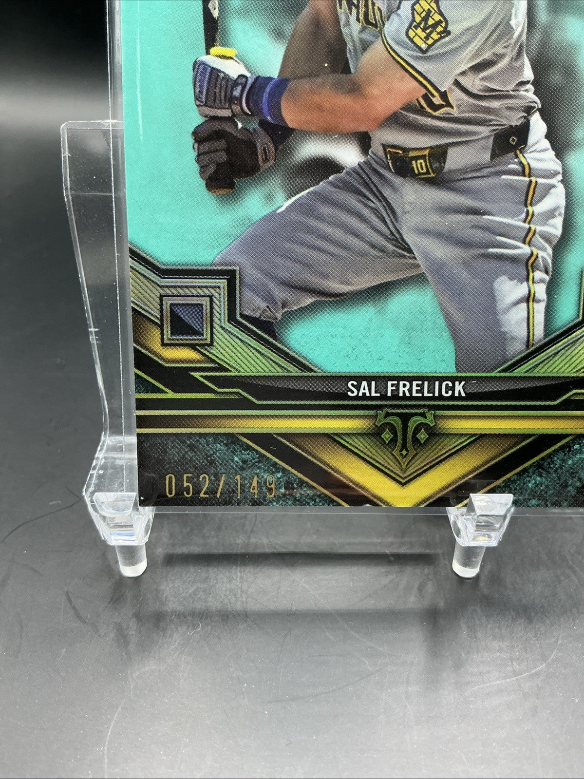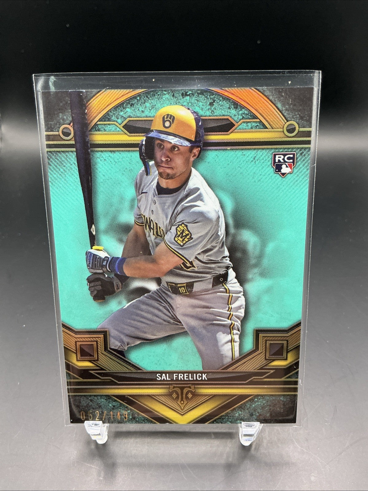 The 2024 Topps Triple Threads Sal Frelick #183 Aquamarine /149 trading card is a highly sought-after collectible for fans of Major League Baseball and the Milwaukee Brewers. Featuring a limited print run of only 149, this rookie card showcases a unique aquamarine parallel variety that sets it apart from the base set. This particular card, manufactured by Topps, is serial numbered and part of the Topps Triple Threads series for the 2024 season, making it a valuable addition to any baseball card collection.