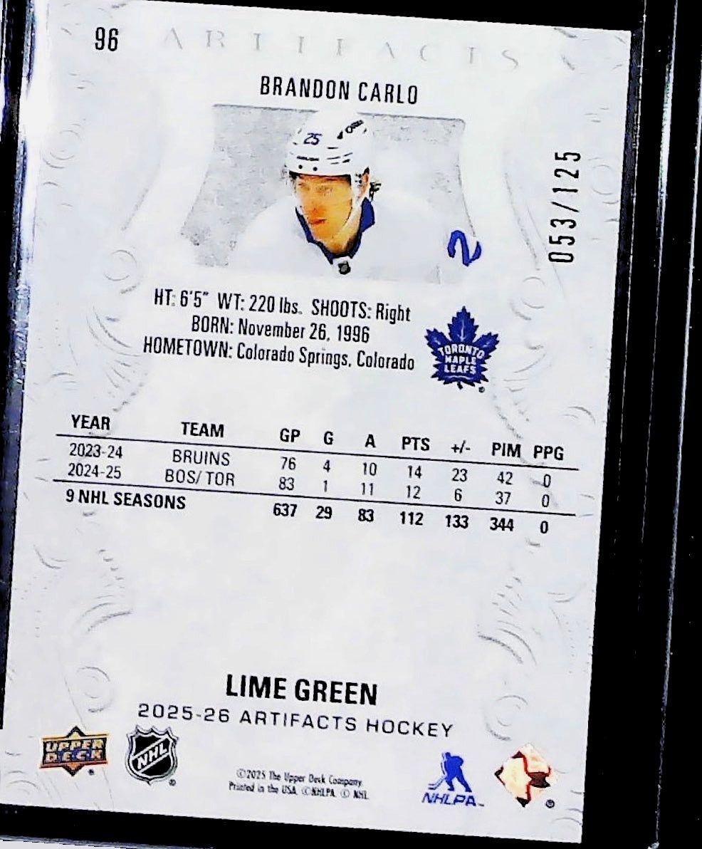 2025-26 Upper Deck Artifacts Hockey Brandon Carlo Lime Green /125 MAPLE LEAFS0