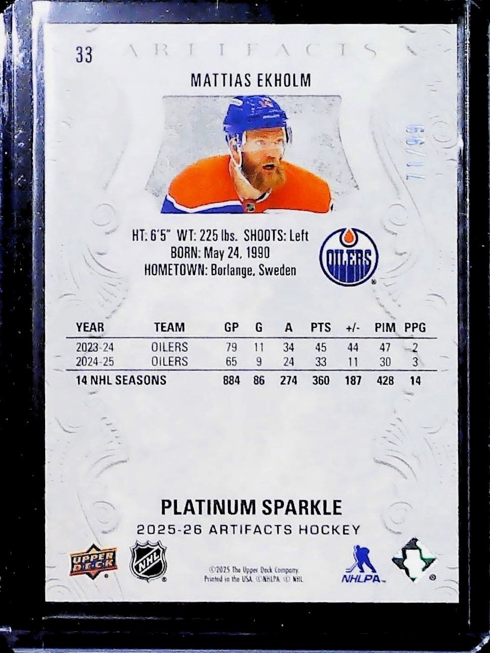 2025-26 Upper Deck Artifacts Hockey Mattias Ekholm Platinum Sparkle /99 OILERS