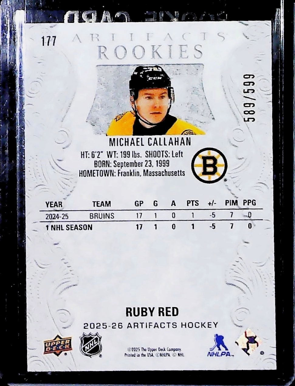 2025-26 Upper Deck Artifacts Hockey Michael Callahan Rookies Ruby Red /599 BRUIN0