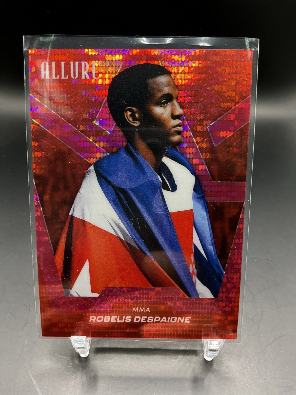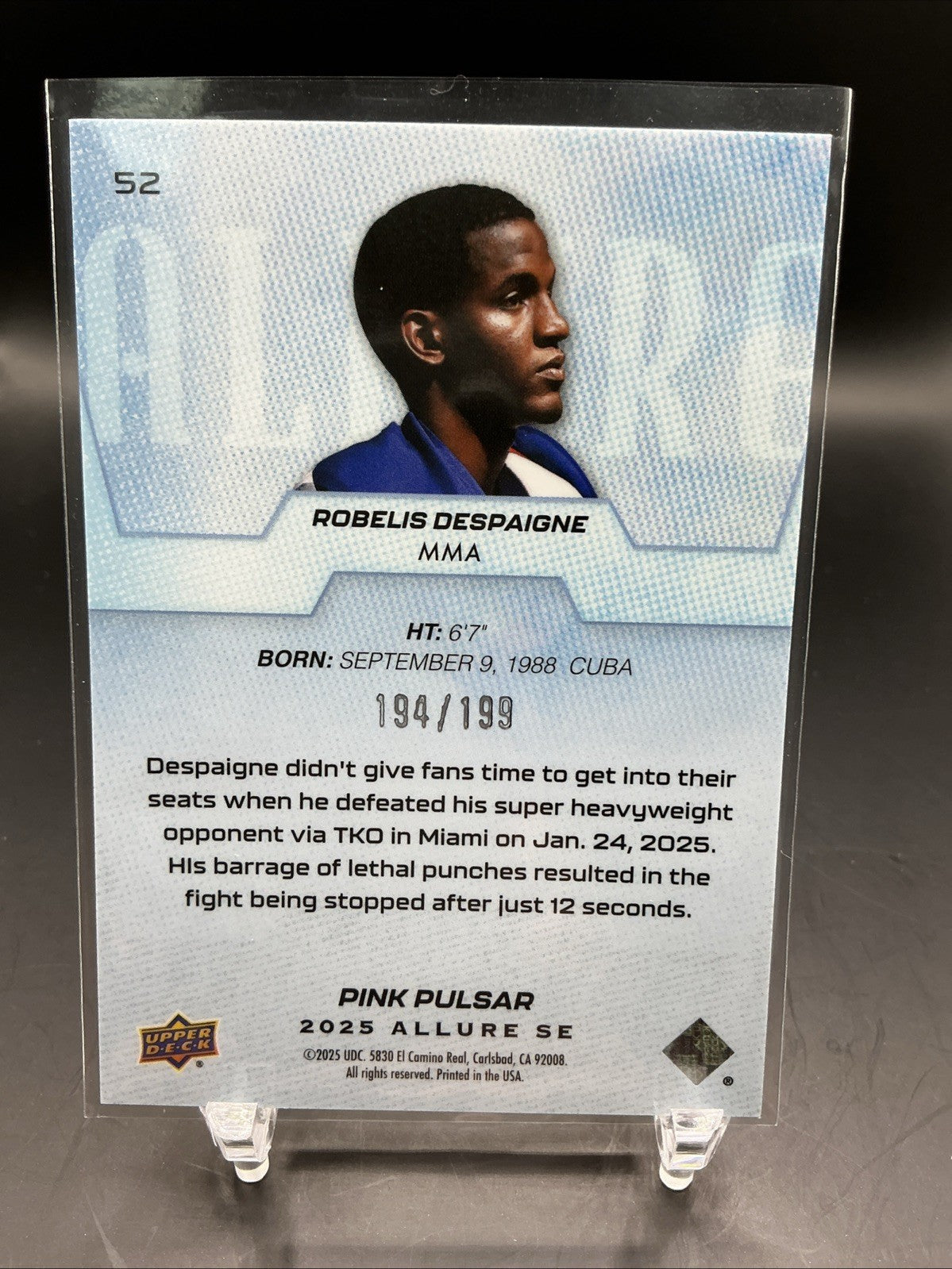 The 2025 Allure SE ROBELIS DESPAIGNE Pink Pulsar Parallel #52 trading card is a limited edition collectible featuring a stunning design and specific serial numbering. Manufactured by Upper Deck, this card is part of the 2025 Allure SE set and is parallel in variety, making it a rare find for collectors. With only 199 cards produced, this MMA trading card is a sought-after item for fans of the sport and card enthusiasts alike.