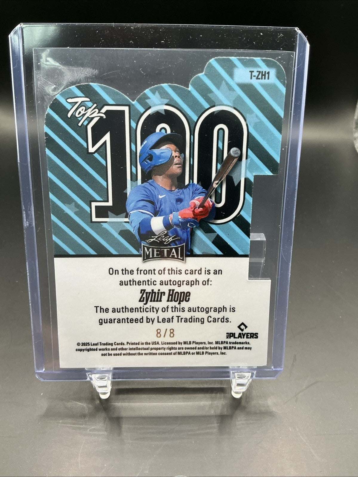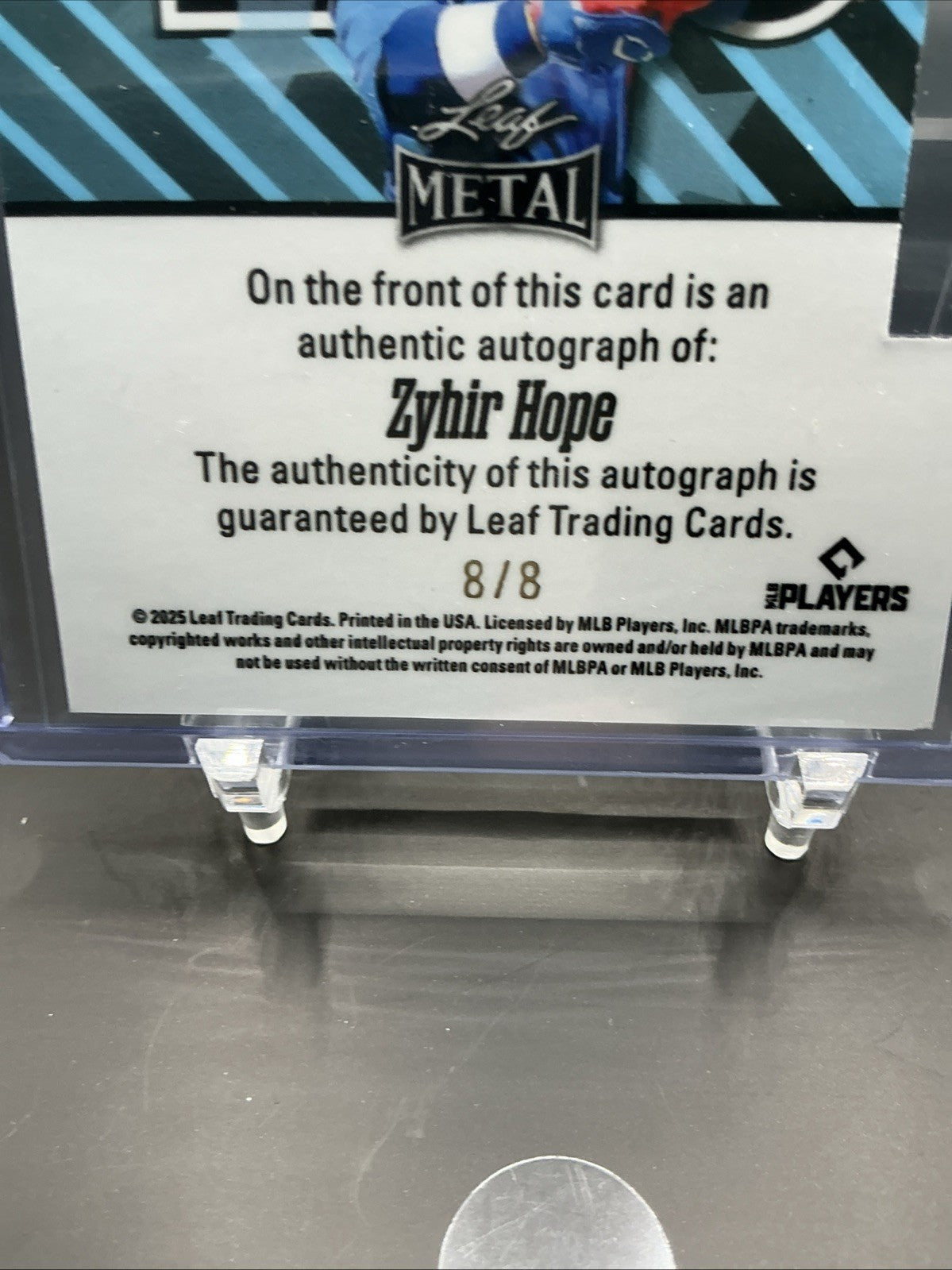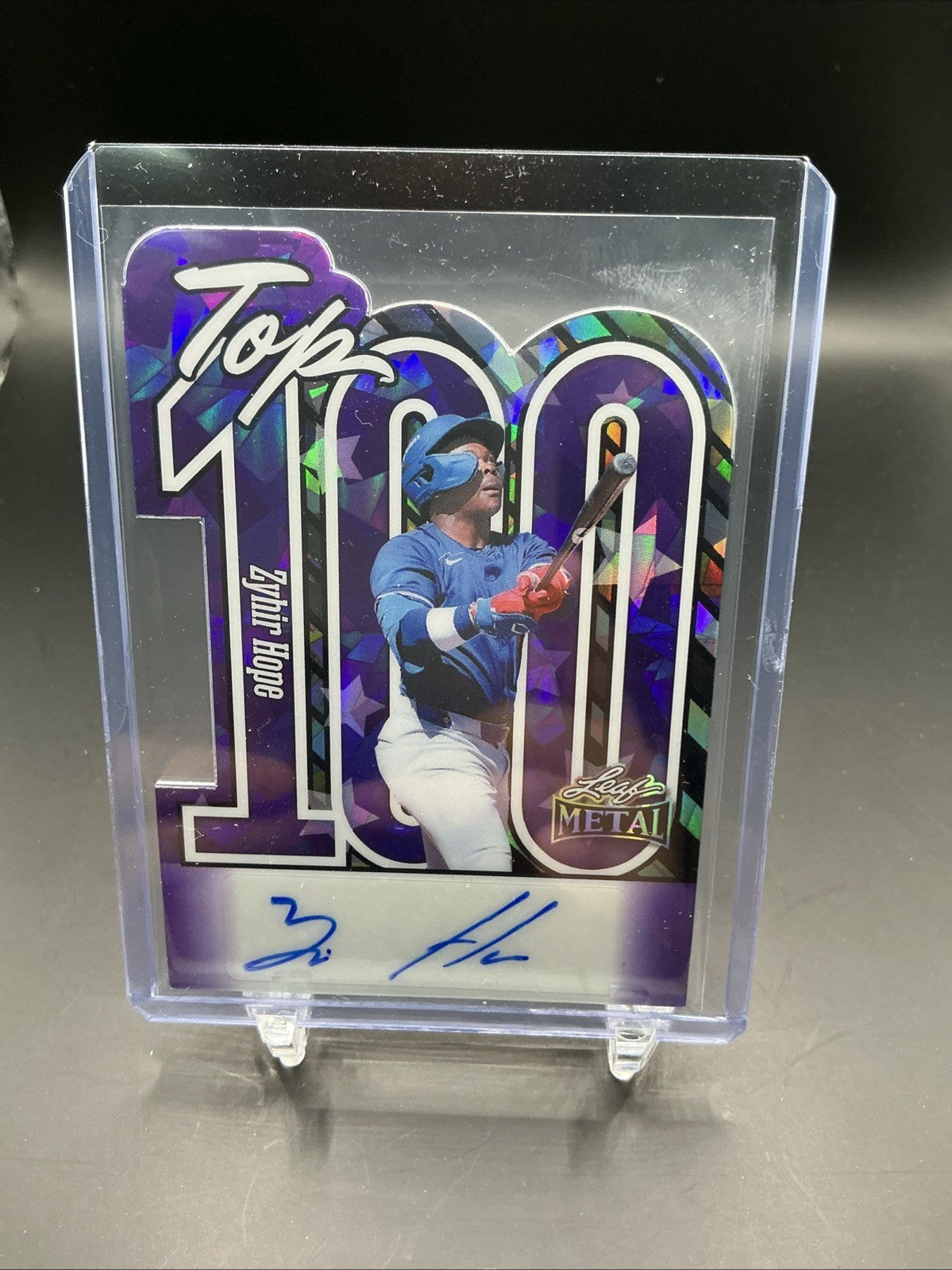 The product is a rare and highly collectible 2025 Leaf Metal Top 100 Zyhir Hope Auto Purple Ice trading card. This baseball card features a unique purple ice parallel variety and is made of durable metal material. With a limited edition of only 8 cards produced, this card is a special short print (SSP) addition to any sports trading card collection. The card is autographed by the player and showcases a promising talent in the 2025 baseball season, making it a valuable and sought-after item for collectors and fans.
