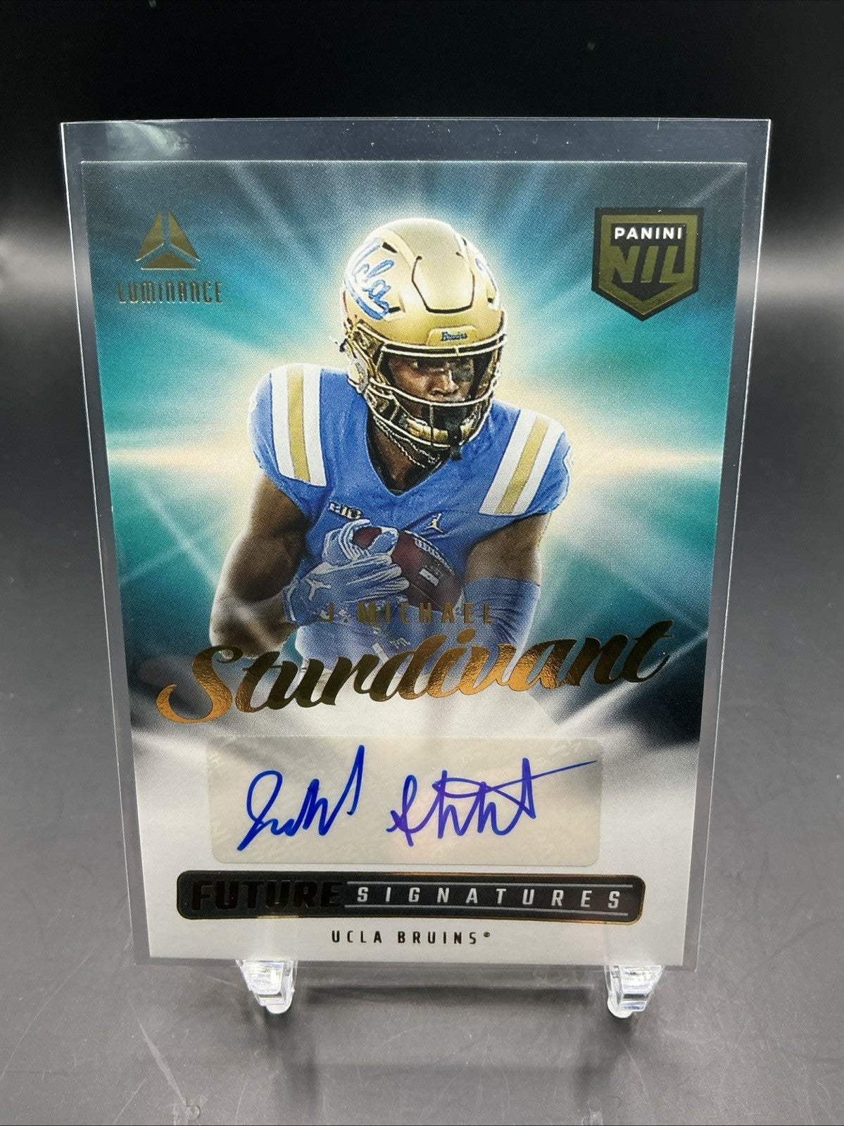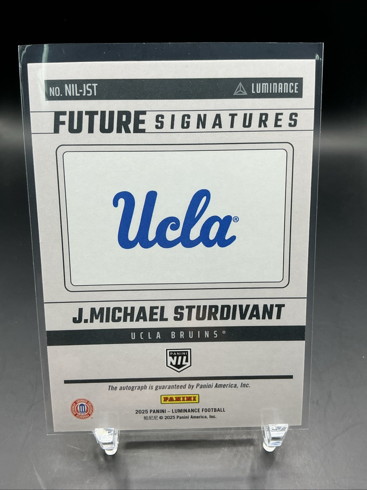 The 2025 Luminance J. Michael Sturdivant Auto Gold trading card is a highly sought-after collectible featuring an autograph from the player. Manufactured by Panini in 2025, this sports trading card is part of the National Collegiate Athletic Association (NCAA) league, specifically showcasing the UCLA Bruins football team. This original card is made of card stock with a 20 Pt. thickness, and comes with Panini Authentic autograph authentication. As a rookie card with a gold parallel variety, this card is a valuable addition to any sports memorabilia collection.