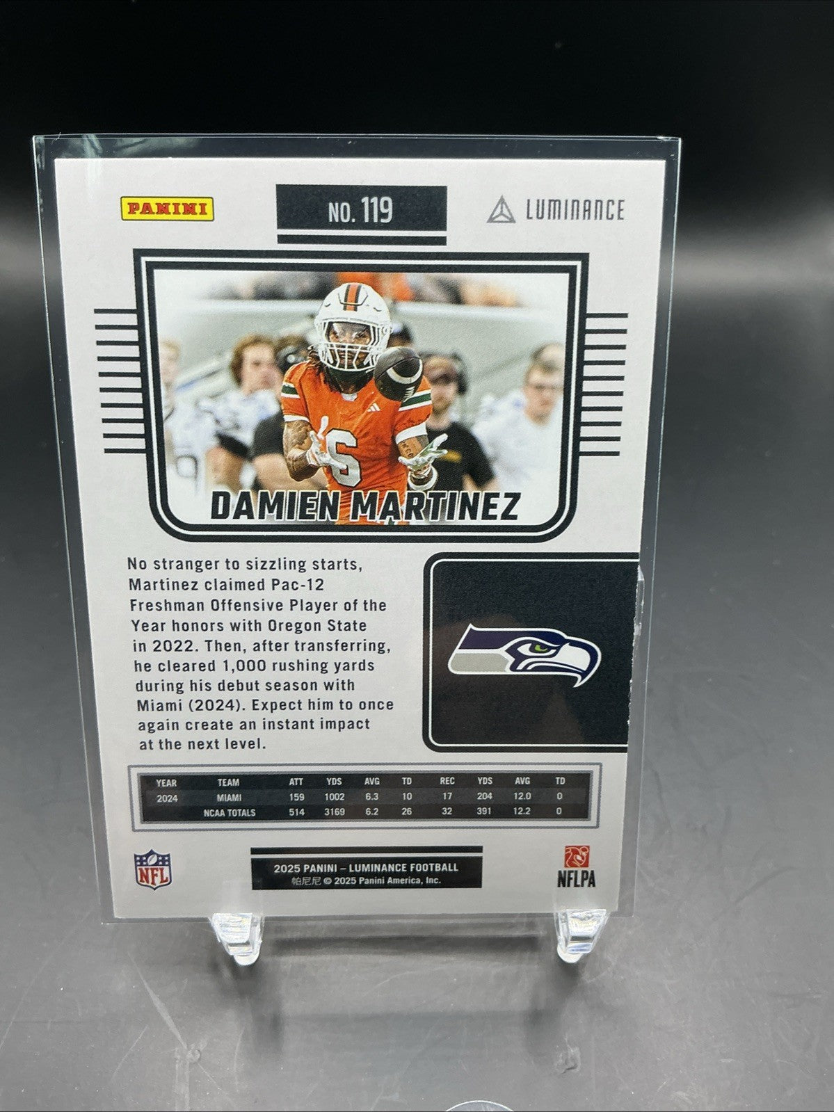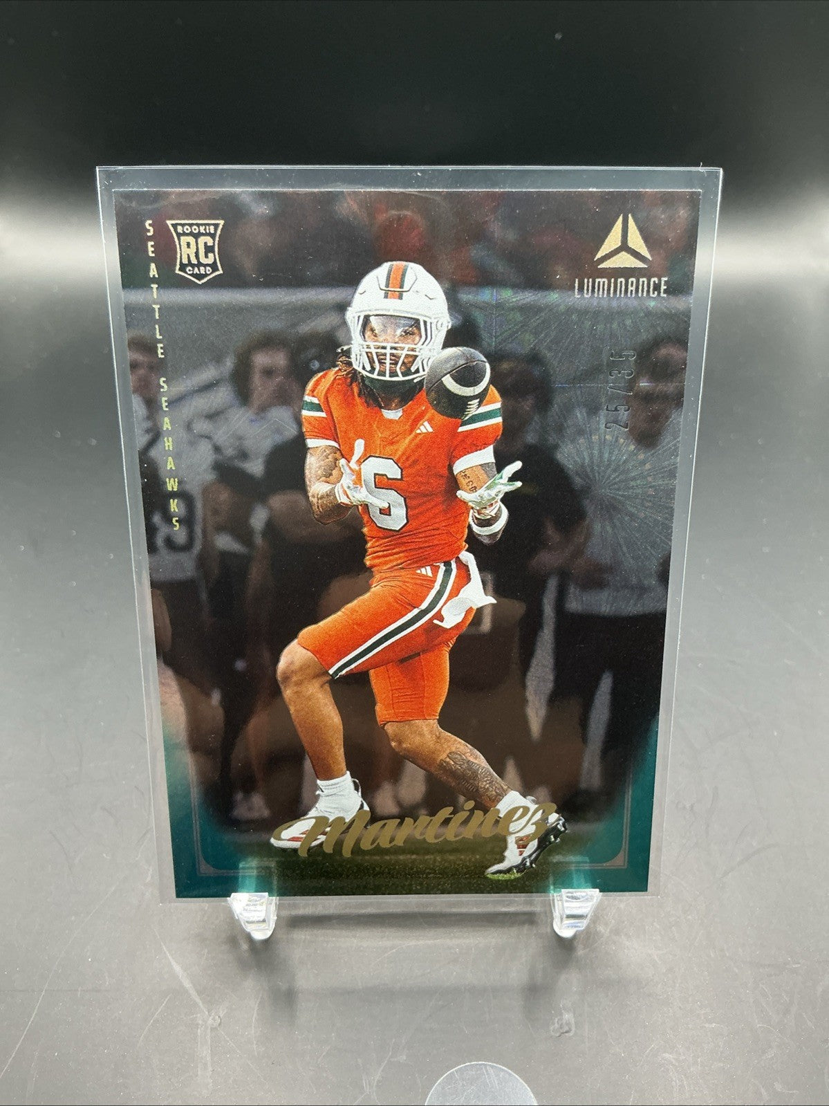 The 2025 Panini Luminance Damien Martinez Teal RC #119 trading card features a rookie player from the Seattle Seahawks in the National Football League (NFL). This original card is made of card stock, has a thickness of 20 Pt., and is part of the base set. It is autographed with a label or sticker and is authenticated by Panini Authentic. The card is in English and was manufactured in the United States, making it a valuable addition to any football trading card collection.