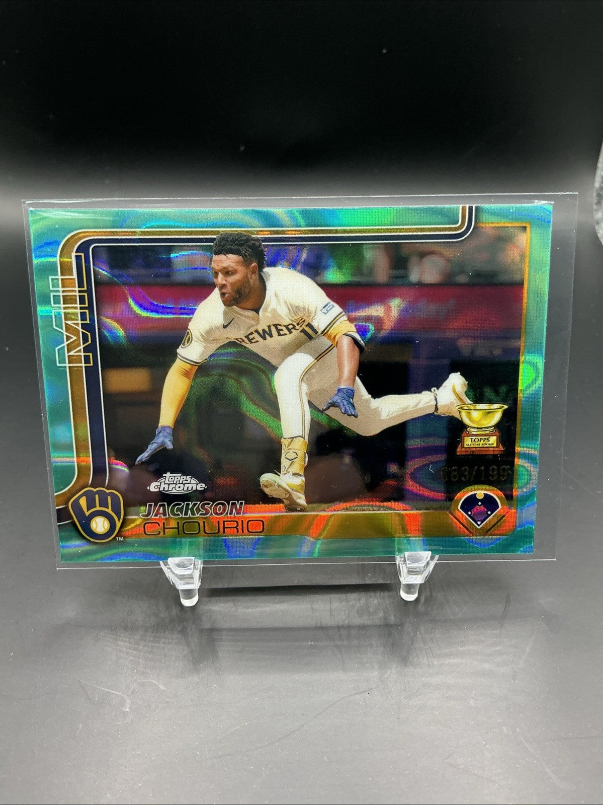 The product is a 2025 Topps Chrome Baseball trading card featuring Jackson Chourio of the Milwaukee Brewers. This particular card is an Aqua Ray Wave parallel with a serial number out of 199. Manufactured by Topps in the United States, the card is a standard size for Major League Baseball trading cards. It is an original release and is written in English. This collectible item is a part of the 2025 Topps Chrome set and is a valuable addition for baseball fans and trading card enthusiasts.