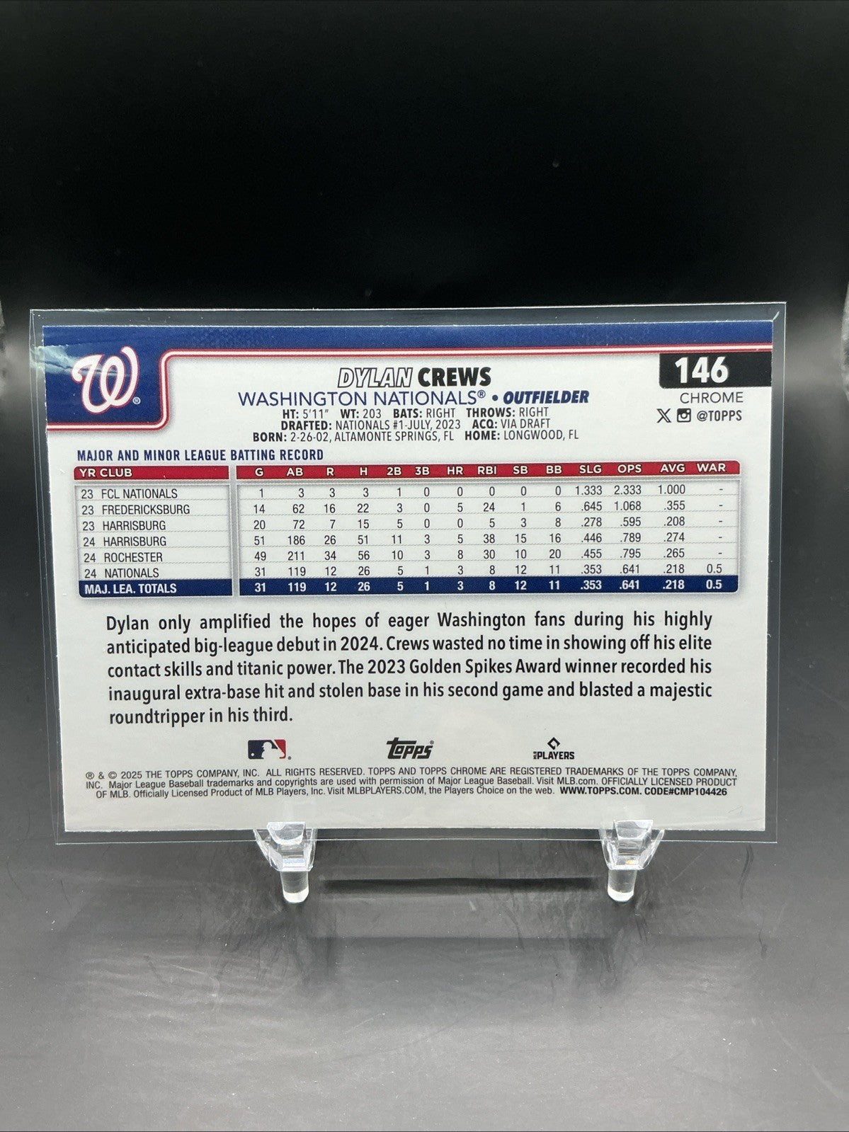 The 2025 Topps Chrome Dylan Crews Rookie Prism Refractor #146 is a standard-sized sports trading card featuring the Major League Baseball player Dylan Crews from the Washington Nationals. Manufactured by Topps in the United States, this original card is a part of the 2025 Topps Chrome set and belongs to the Chrome parallel/variety. The card is made of card stock and includes the player's autograph in a hard-signed format, authenticated by Topps. This collectible item is perfect for baseball fans and card collectors looking to add a unique piece to their collection from the MLB World Series.