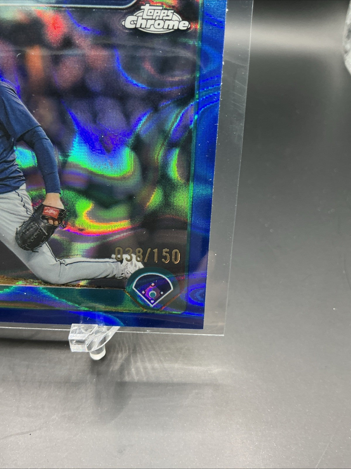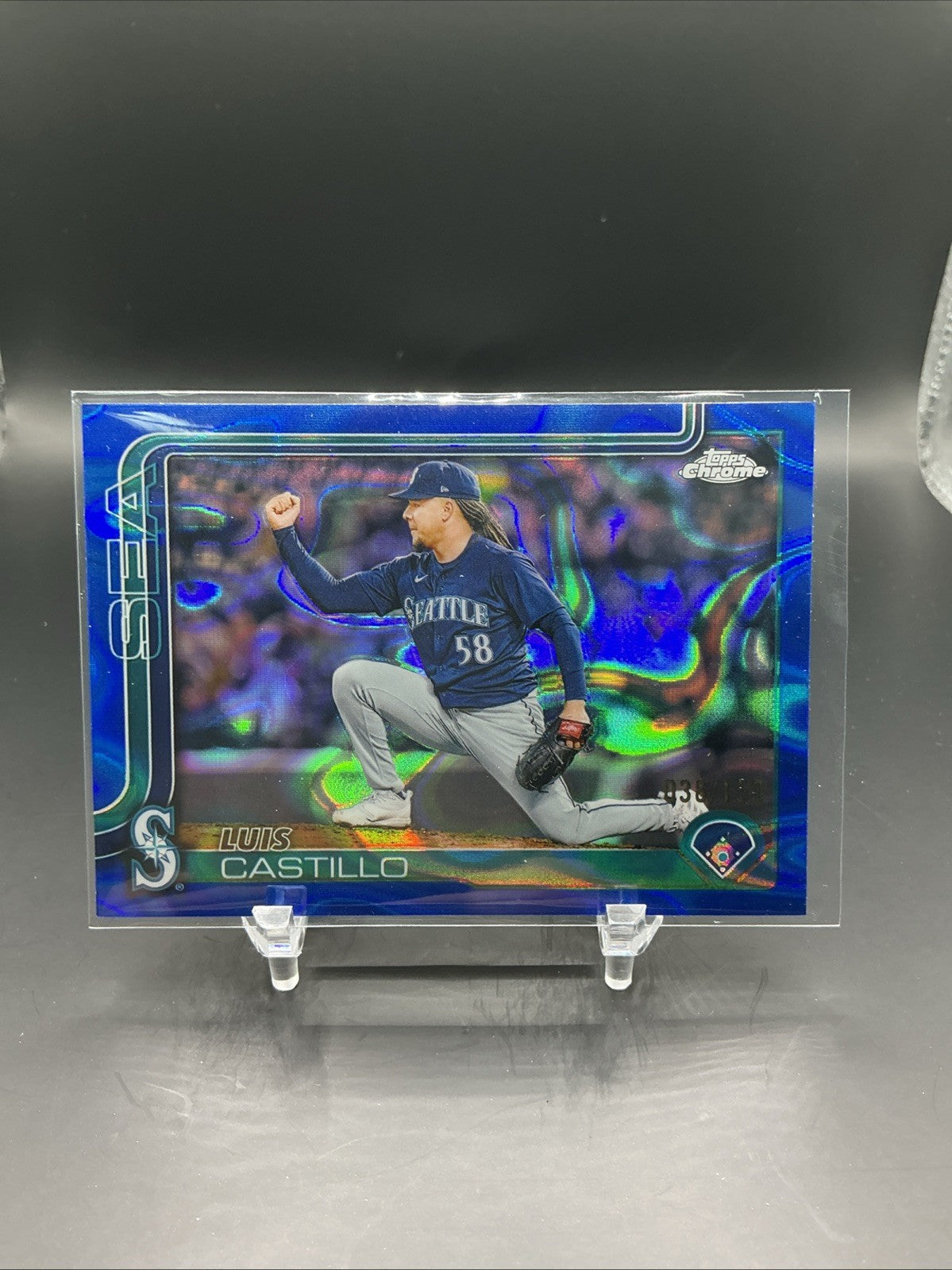 The product is a 2025 Topps Chrome trading card featuring Luis Castillo of the Seattle Mariners. This particular card is a Blue Lava Refractor parallel, numbered out of 150. As a collectible in the sports trading card market, it appeals to fans and collectors looking to add a rare and unique piece to their collection. The card is from the Topps Chrome set, known for its shiny and reflective design, making it a sought-after variety among baseball card enthusiasts.
