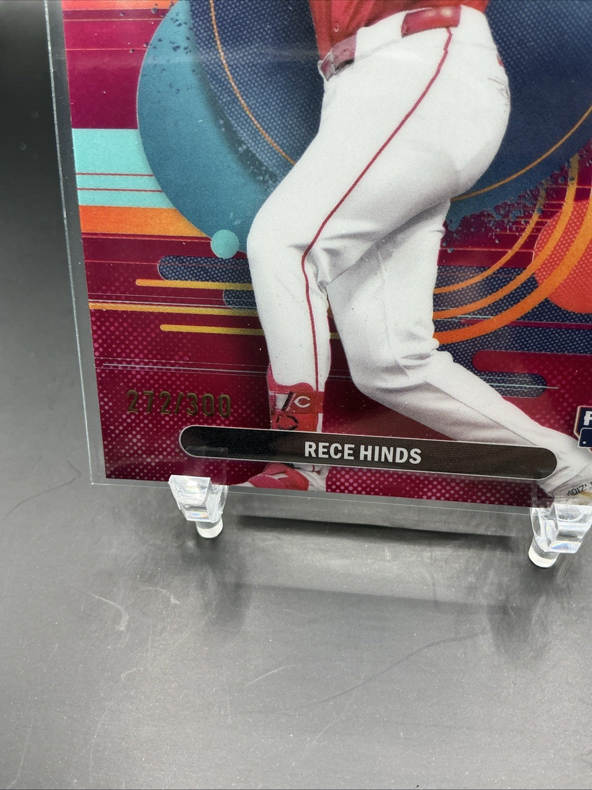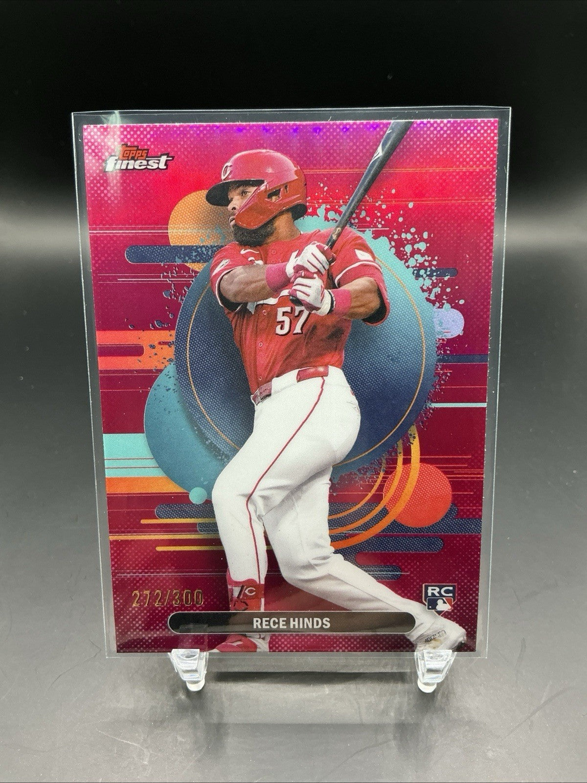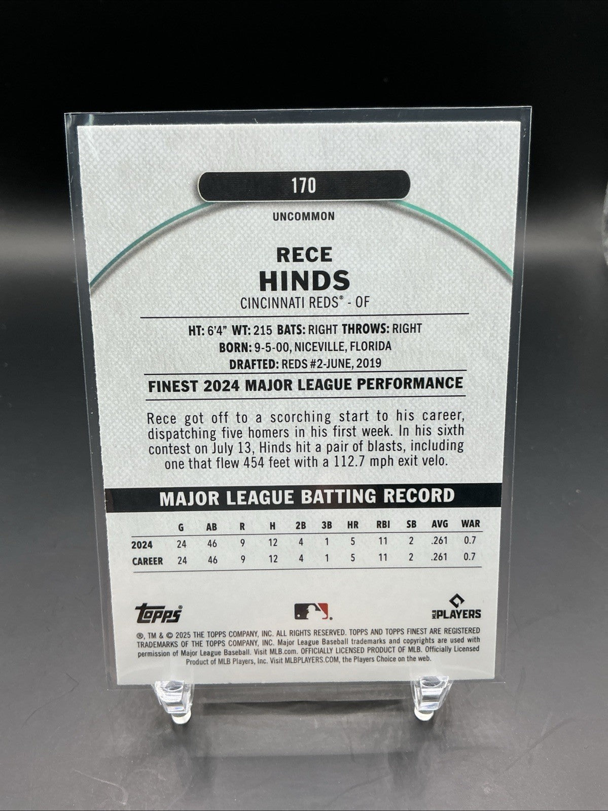 The product is a 2025 Topps Finest trading card featuring rookie player Rece Hinds from the Cincinnati Reds. This specific card is part of the Uncommon subset, with a Pink parallel numbered out of 300. It is a non-autographed card from the MLB league, manufactured by Topps in English language.