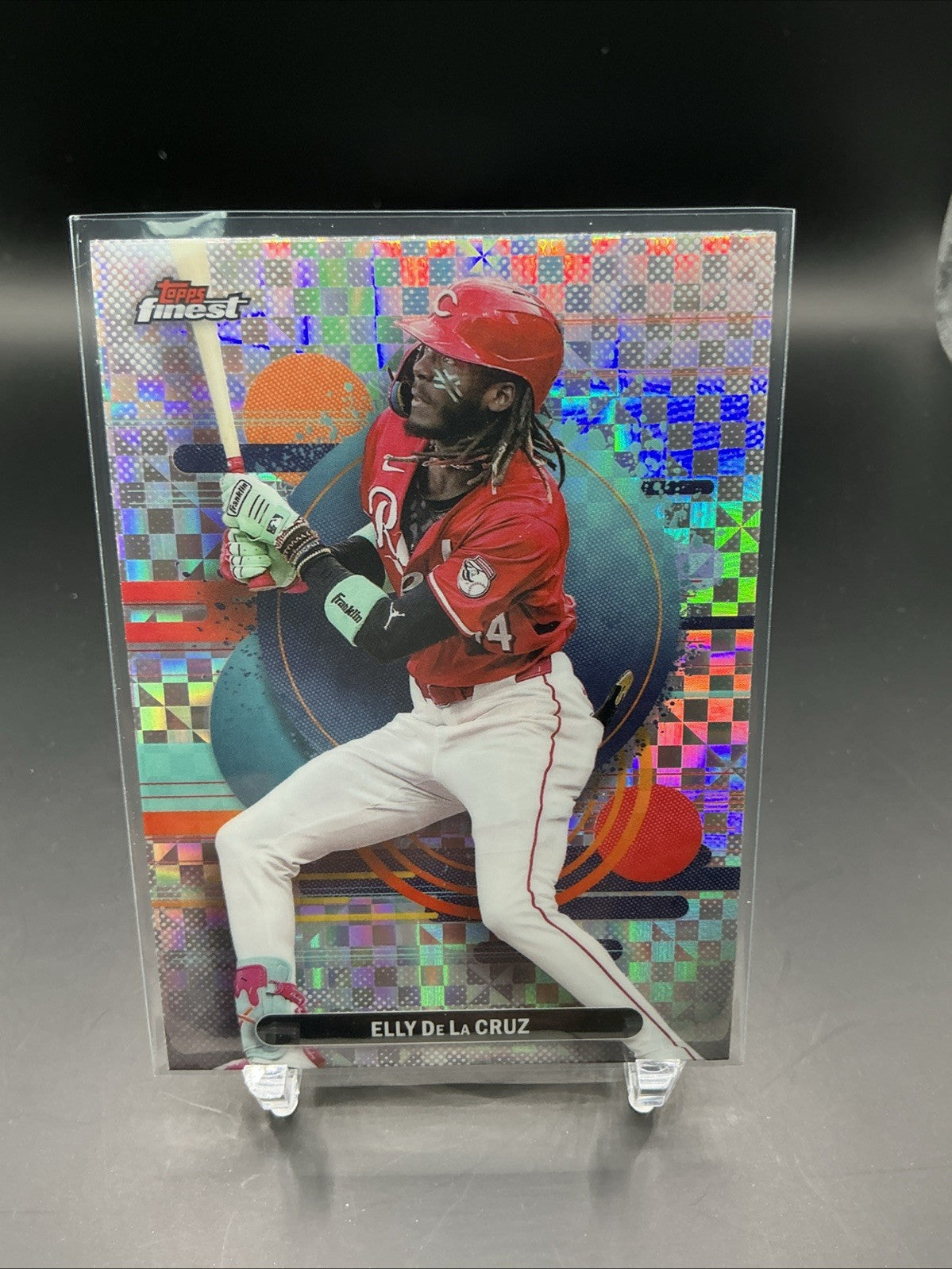 The 2025 Topps Finest Elly De La Cruz Uncommon Checkerboard #154 trading card is a highly sought-after collectible for baseball fans. Manufactured by Topps, this refractor card features an uncommon checkerboard design, making it a unique addition to any collection. With a focus on the player Elly De La Cruz, this card is a must-have for fans of the sport looking to collect the latest and greatest from the 2025 season.