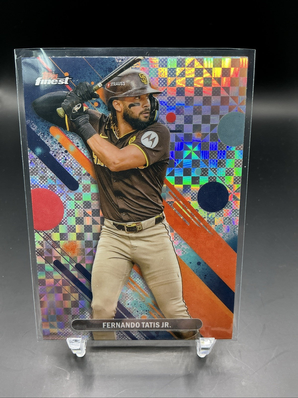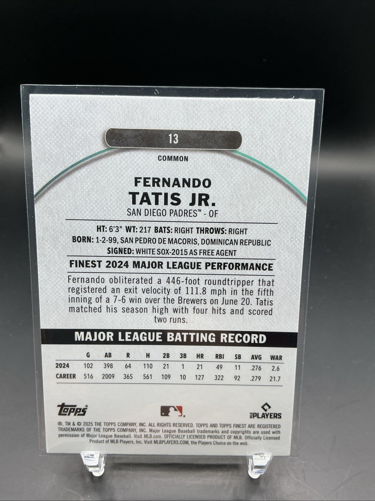 The 2025 Topps Finest Fernando Tatis Jr. Checkerboard #13 trading card features the MLB player from the San Diego Padres. This sports trading card is part of the 2025 Topps Finest set and is manufactured by Topps. The card is not autographed and does not come with any memorabilia. It is a parallel variety with a checkerboard design, making it a unique collectible item for fans of baseball and trading cards.